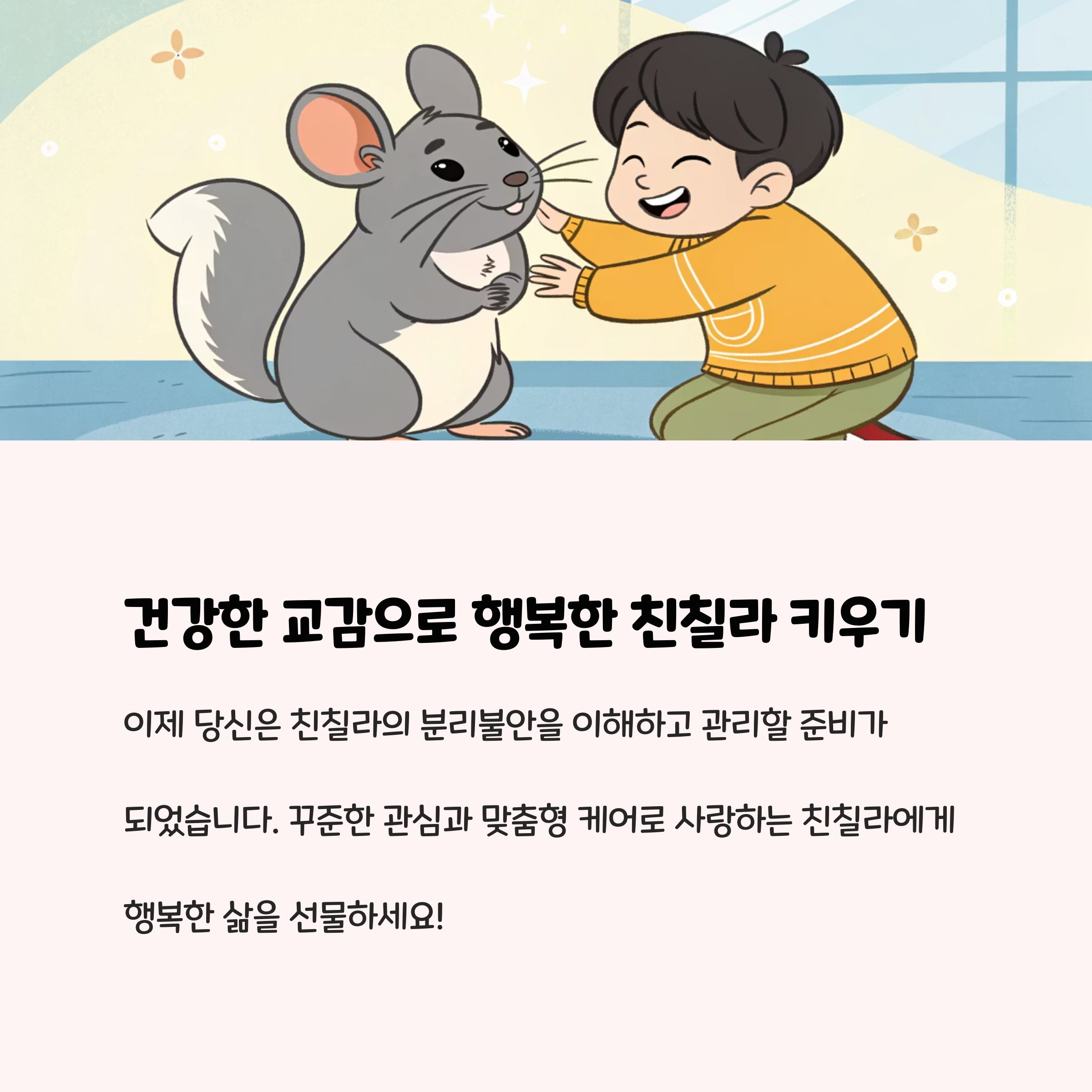분리불안 극복의 핵심은 보호자의 꾸준한 관심과 맞춤형 케어입니다. 은신처 마련, 교감 시간 확보, 환경 풍부화, 점진적 분리 훈련 등 다양한 방법을 지속적으로 실천하면 친칠라의 불안은 점차 완화될 수 있습니다. 증상이 심할 땐 전문가 상담이 필요합니다.
