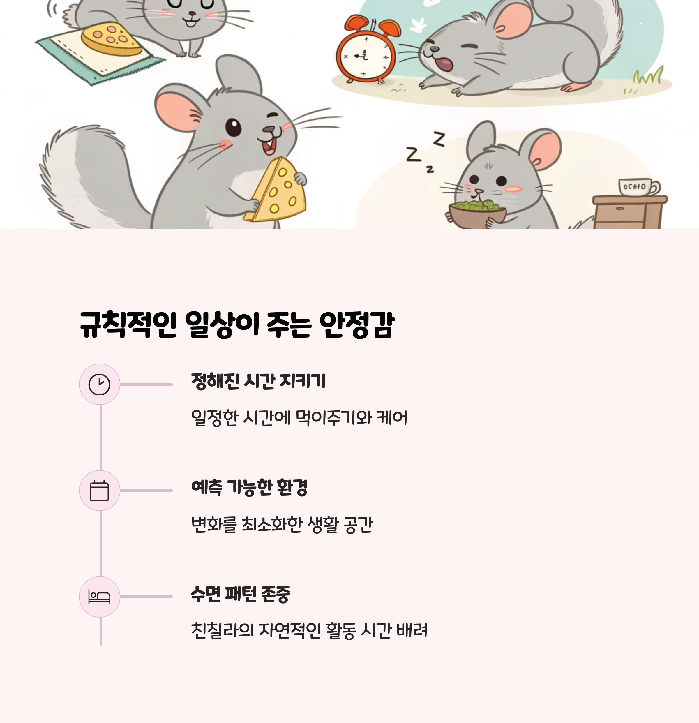 - 정해진 시간에 먹이 급여: 일정한 루틴을 유지하면 친칠라가 예측 가능한 환경에서 안정감을 느낍니다.
