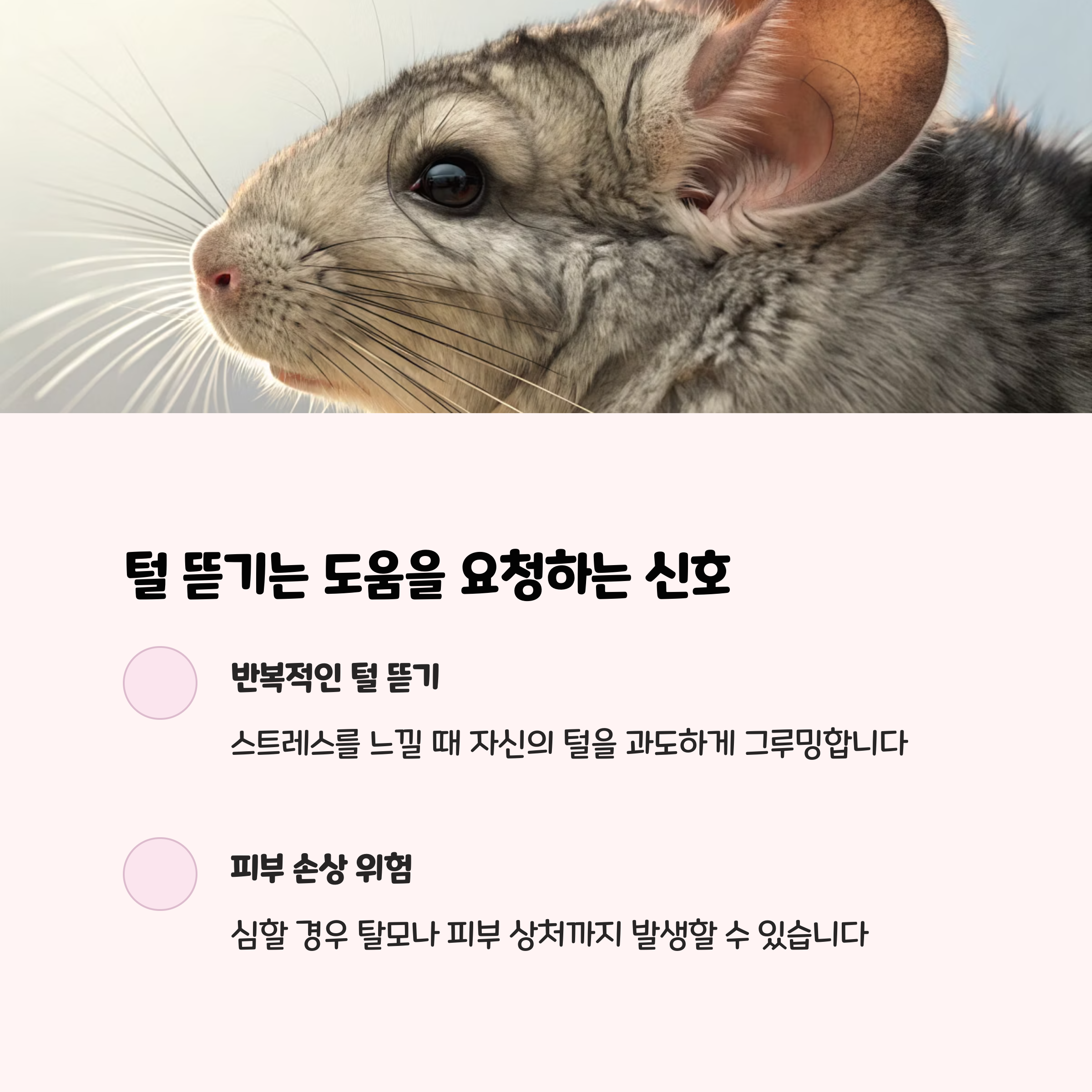 친칠라가 스트레스를 받으면 모피를 과하게 씹거나 뜯는 행동을 보입니다. 이는 분리불안의 대표적인 신체적 신호로, 심할 경우 피부에 상처가 생기거나 모피가 듬성듬성해질 수 있습니다.