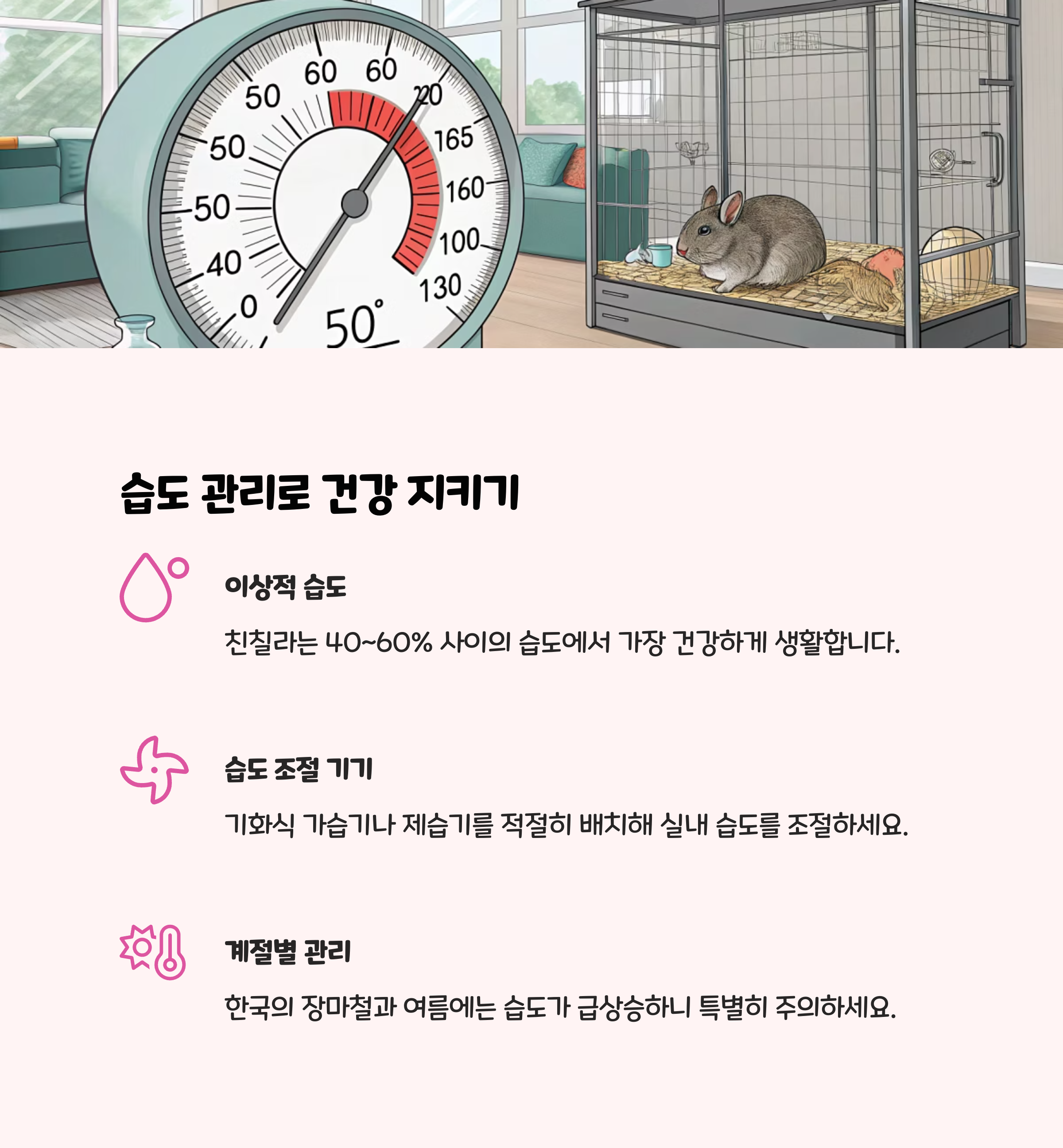 친칠라는 18~24도, 습도 40~60%의 환경에서 가장 건강합니다. 온습도계를 설치하고, 여름철에는 25도 이상 올라가지 않도록 에어컨을 사용하되, 직접 바람은 피하세요. 겨울철에는 가습기를 활용해 건조함을 막아주세요.