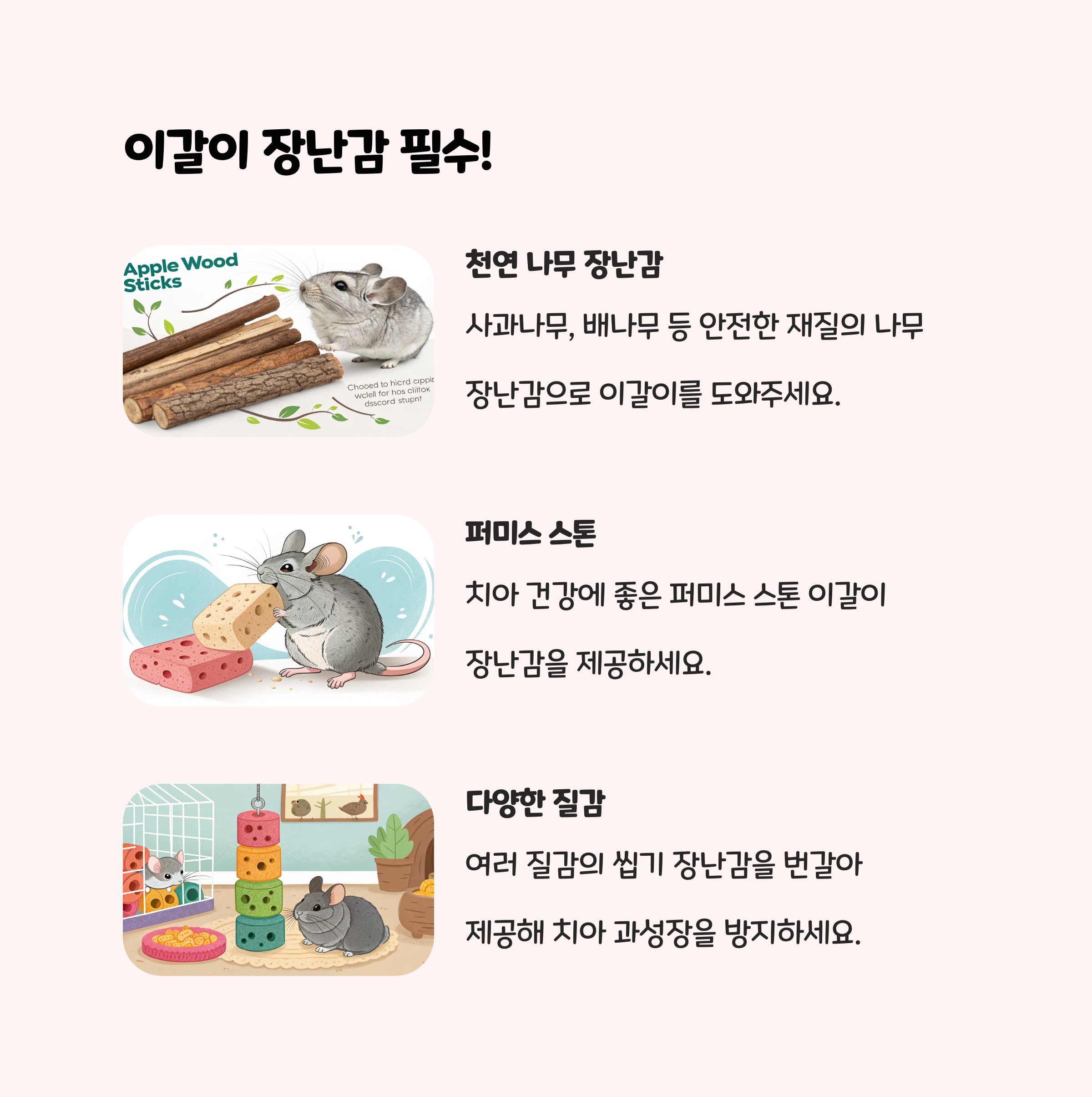 친칠라의 이빨은 평생 자랍니다. 이갈이용 나무, 장난감을 항상 케이지에 두고, 식사량이 줄거나 침 흘림, 털이 젖는 증상이 보이면 치아 검진을 받아야 합니다.