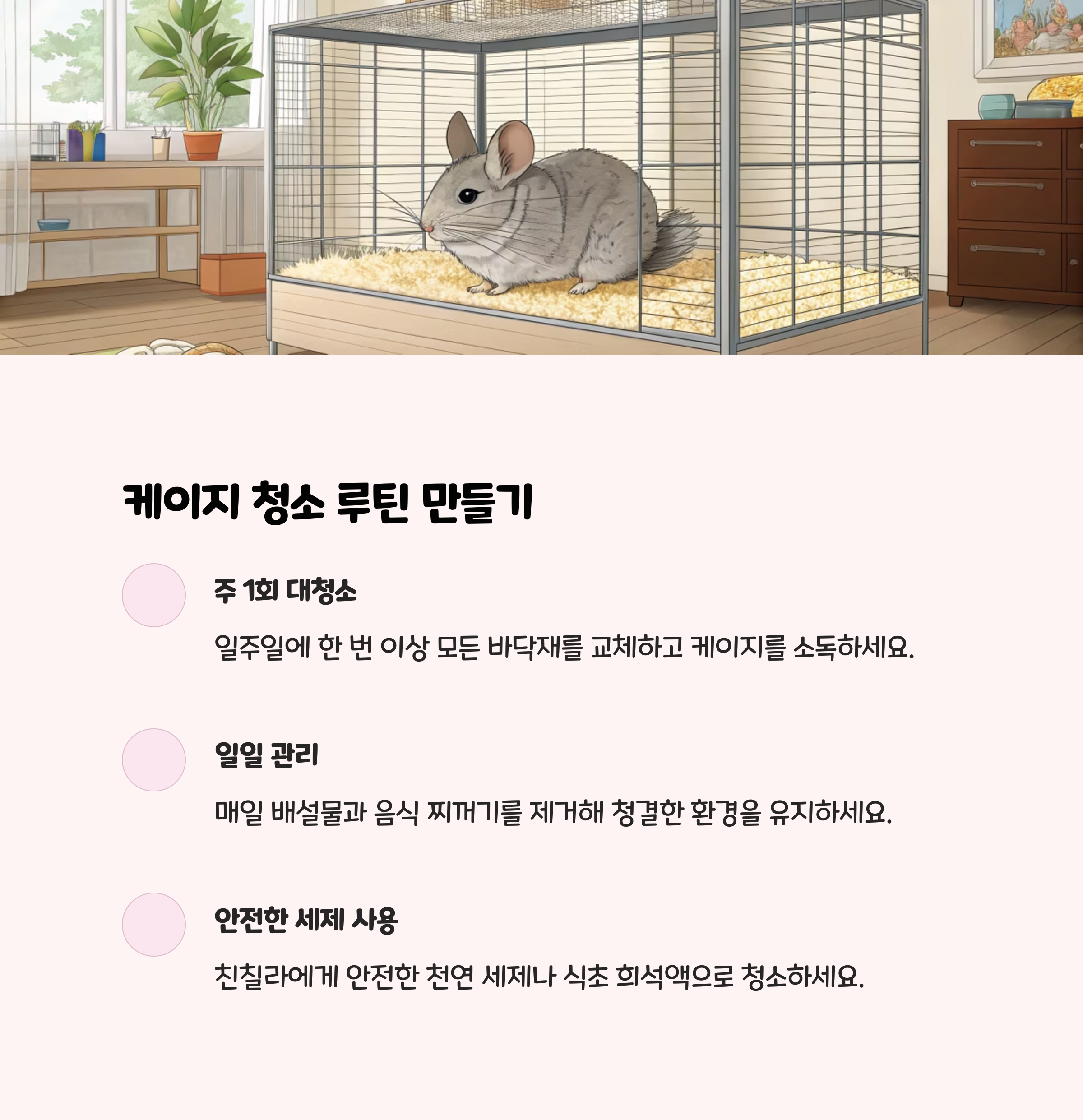 주 1회 이상 케이지를 깊게 청소하고, 바닥재와 은신처, 장난감도 깨끗하게 유지하세요. 친칠라는 하루 250~300번 배변을 하니, 배설물은 수시로 치워주는 것이 좋습니다.