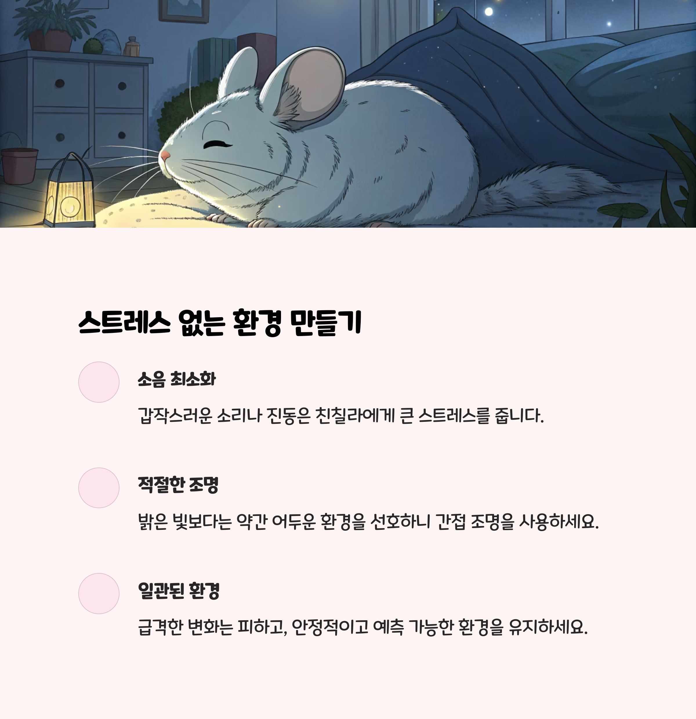 본 내용은 동물전문출판사 씨밀레북스의 『슬픈 역사 공존의 시작 친칠라』, 정보끝판왕, AnimalYomi, 최신 반려동물 사육 가이드에서 제공하는 친칠라 사육 환경, 건강관리, 식단, 스트레스 관리, 응급상황 대처법 등 초보 보호자가 꼭 알아야 할 핵심 정보를 종합한 내용입니다.