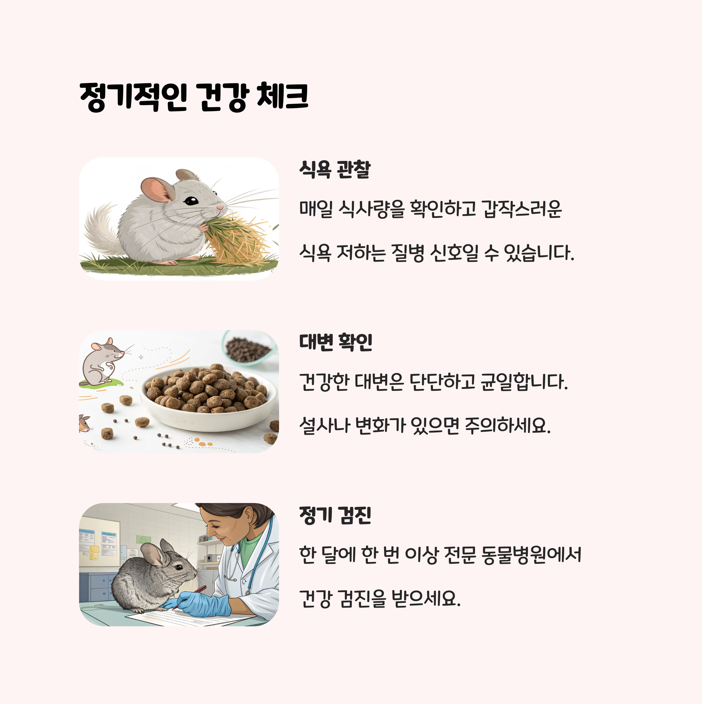 최소 1년에 한 번은 친칠라 진료가 가능한 동물병원에서 건강검진을 받으세요. 특히 치아, 눈, 귀, 피부 상태를 꼼꼼하게 체크해야 합니다.