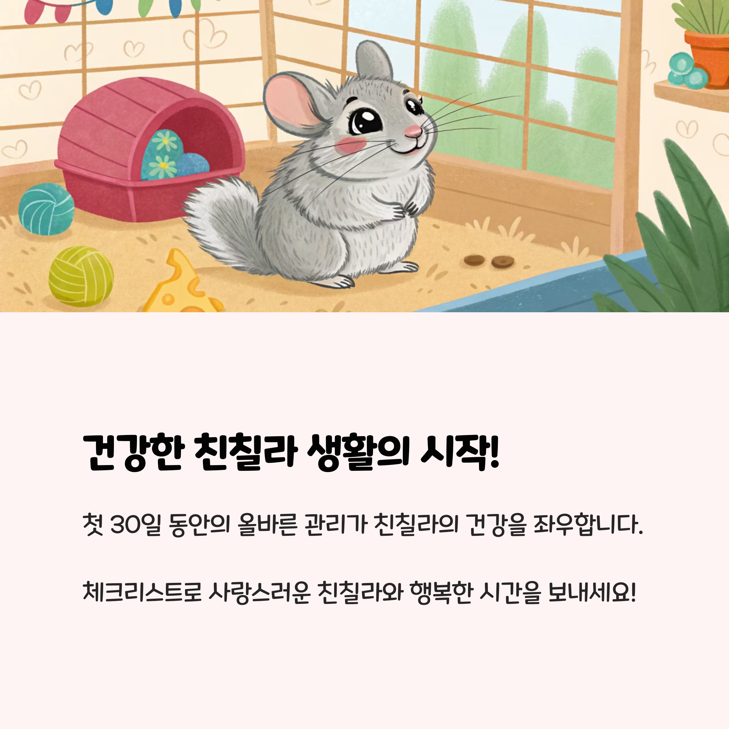 첫 30일은 친칠라와 평생을 함께할 신뢰와 건강의 기초를 다지는 시간입니다. 위 체크리스트를 꼼꼼히 실천한다면, 초보자도 충분히 건강하고 행복한 친칠라 라이프를 시작할 수 있습니다. 작은 변화에도 민감한 친칠라의 마음을 이해하고, 꾸준한 관심과 사랑을 보여주세요. 그러면 어느새 친칠라가 여러분 곁에서 편안히 잠드는 모습을 볼 수 있을 거예요.