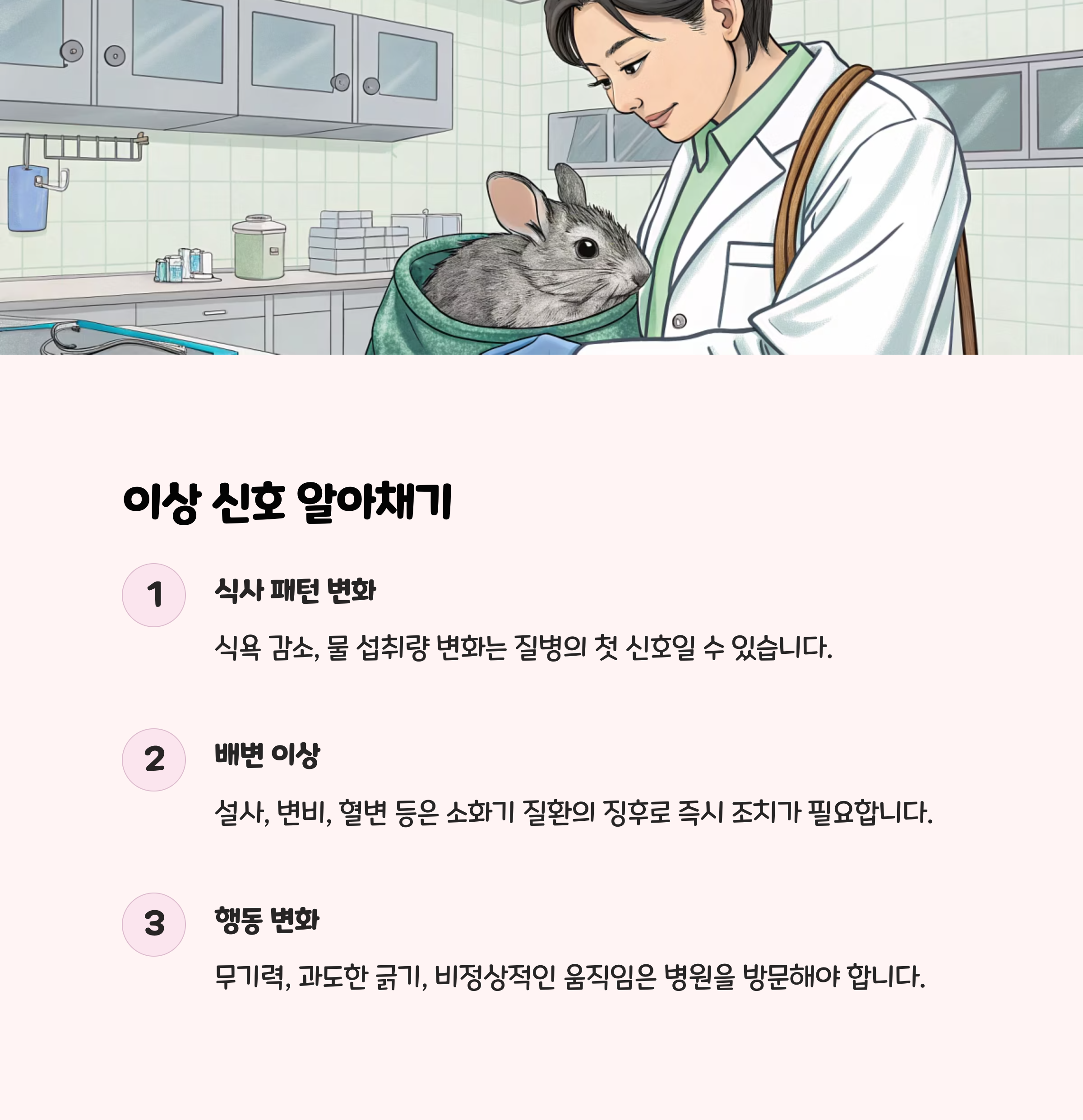 - 식사량 급감, 설사, 무기력, 원형탈모, 침 흘림 등 이상 증상이 보이면 즉시 동물병원 방문