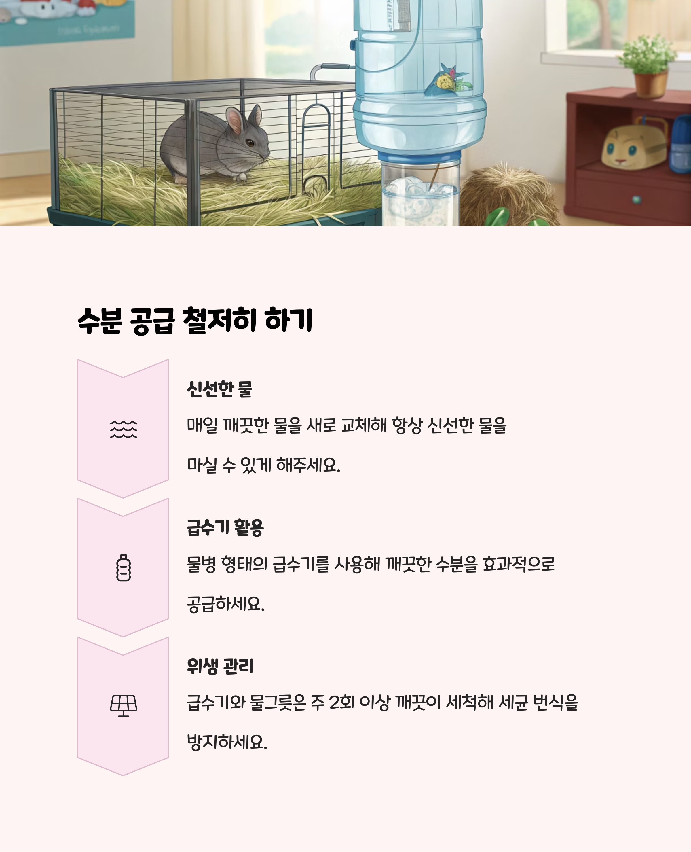 물병은 매일 세척하고, 물이 떨어지지 않게 주의하세요. 친칠라는 처음에는 물을 많이 마시지 않을 수 있지만, 스트레스가 줄면 자연스럽게 마시게 됩니다.