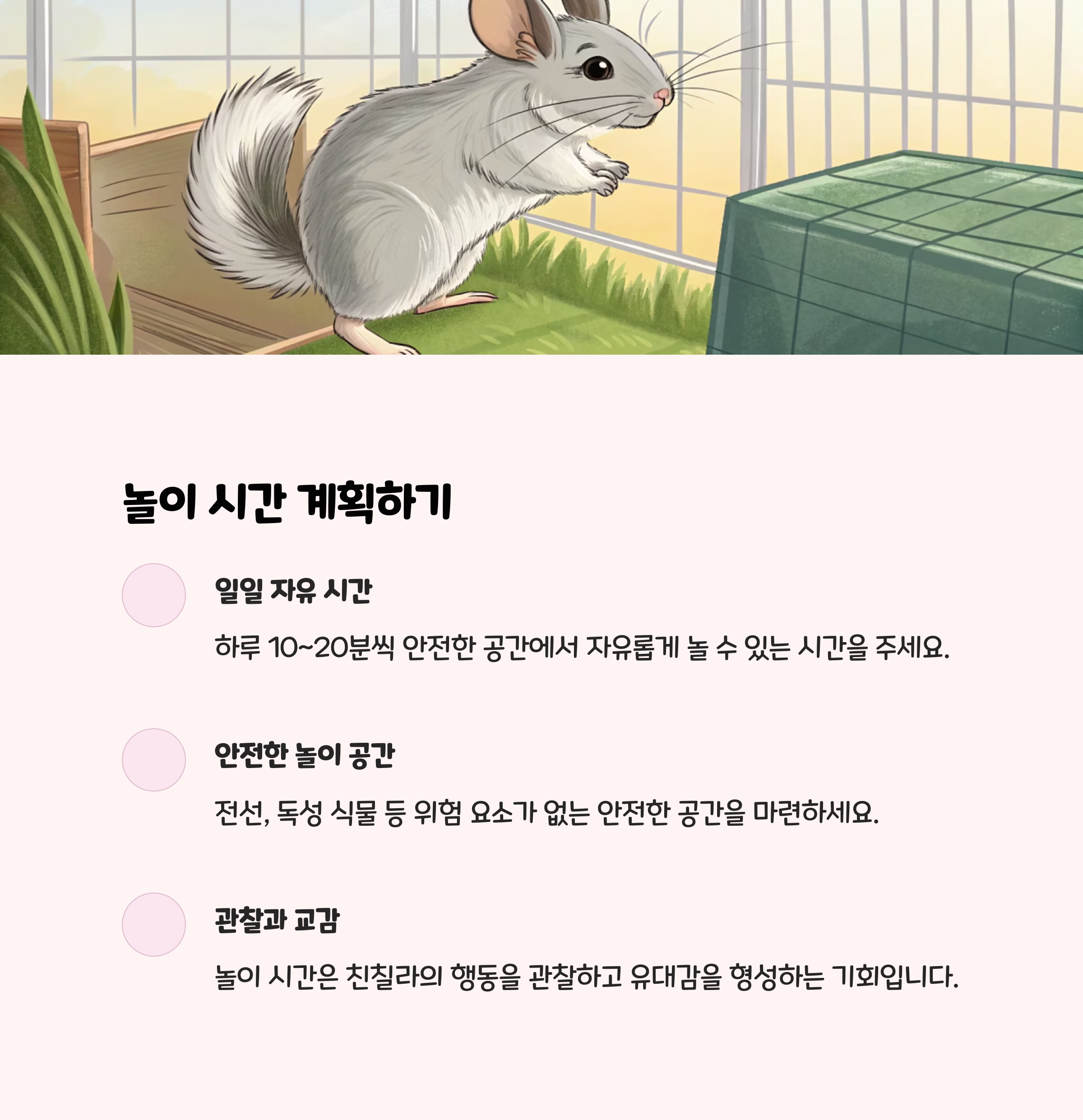 친칠라는 민감하지만 사회적인 동물입니다. 가족과의 교감 시간을 자주 갖고, 처음부터 만지기보다는 손에 간식을 올려두고 천천히 다가가며 신뢰를 쌓으세요.