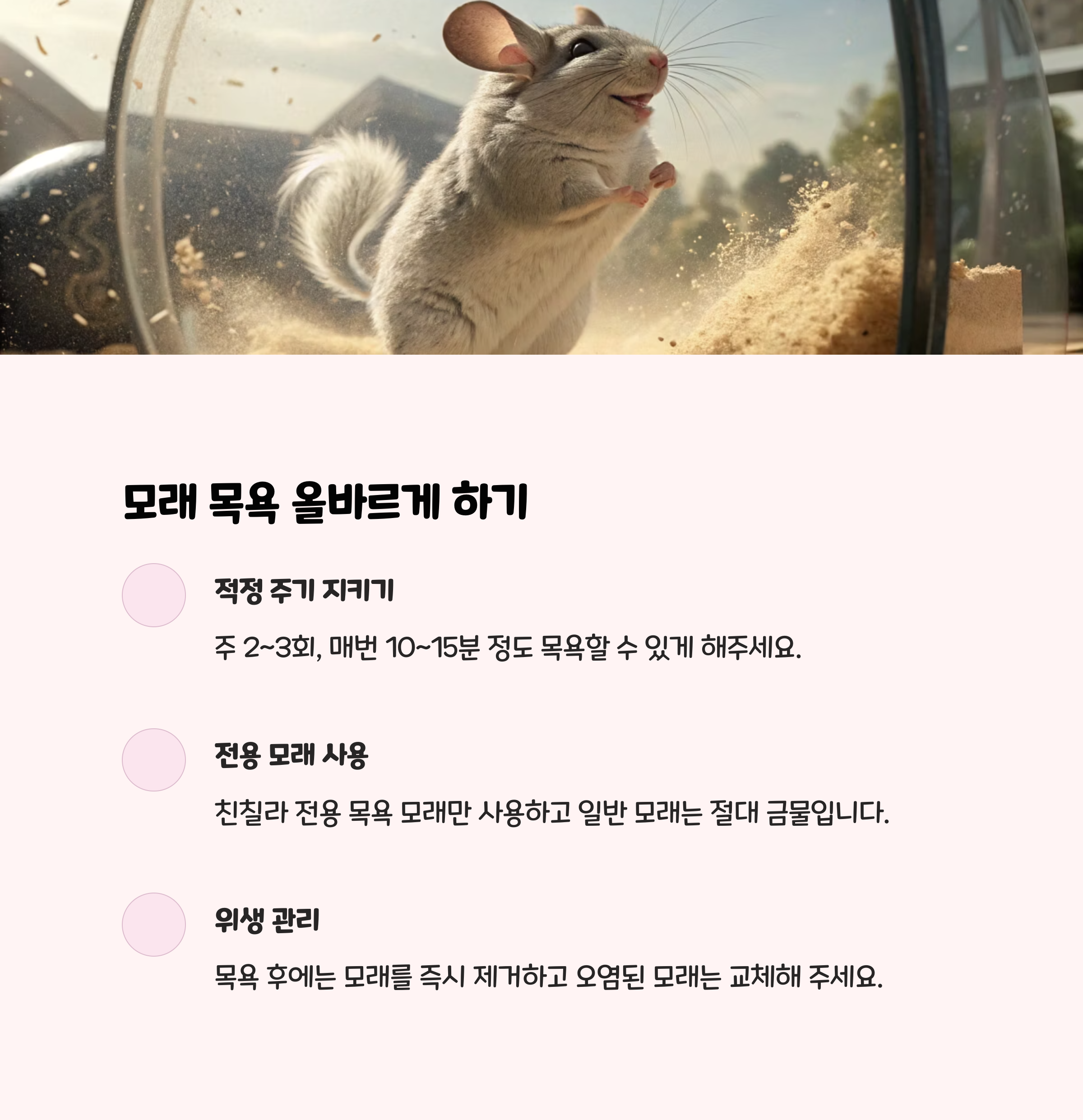 친칠라는 주 2~3회, 10~15분 정도 전용 모래로 목욕을 시켜야 합니다. 물에 젖으면 건강에 심각한 문제가 생길 수 있으니, 절대 물로 씻기지 마세요. 모래는 항상 청결하게 유지하고, 오염되면 바로 교체하세요.
