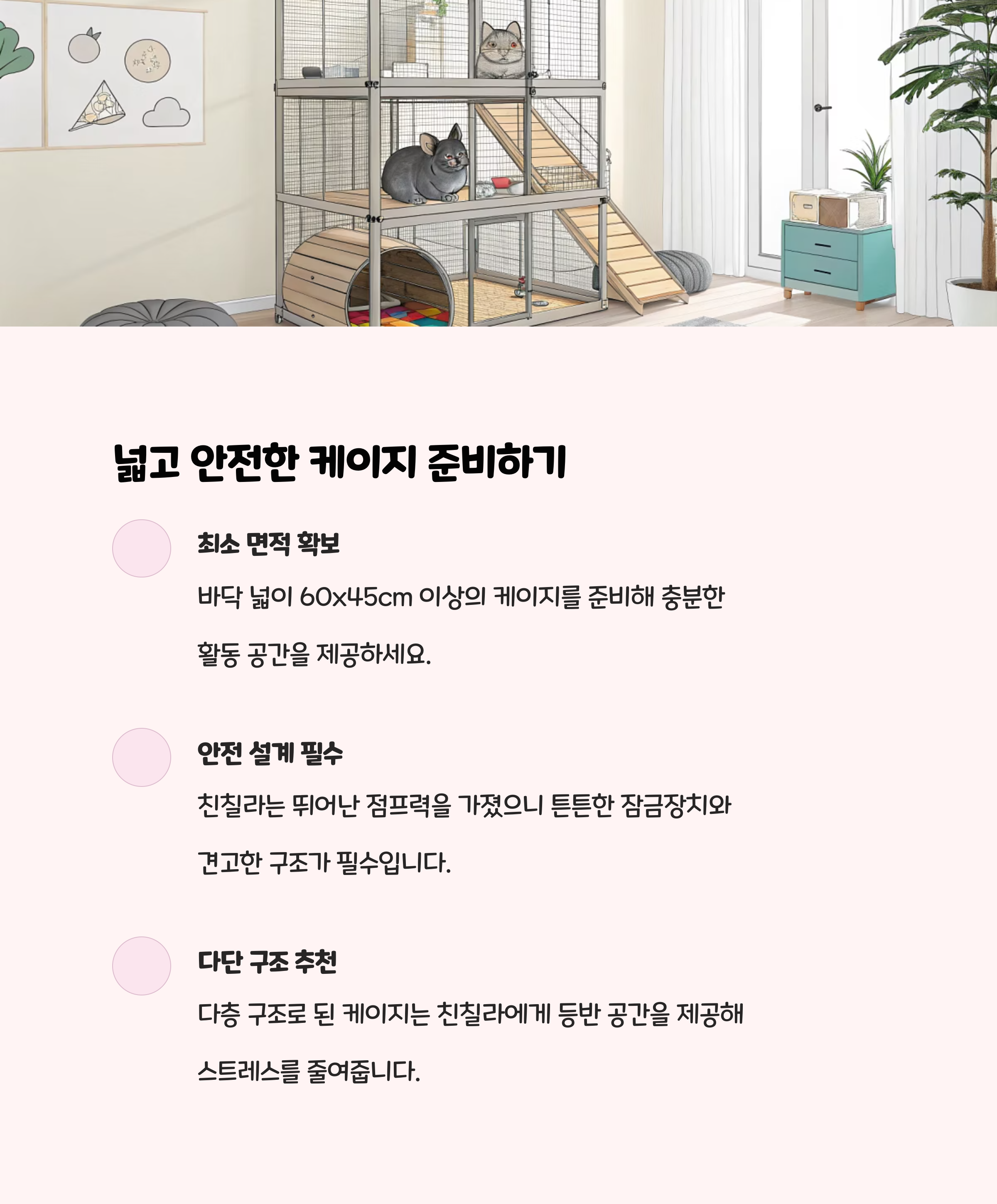 친칠라는 활동량이 많아 최소 가로 60cm x 세로 60cm x 높이 120cm의 다층 케이지가 권장됩니다. 바닥이 단단하고, 발이 빠지지 않는 구조로 선택하세요. 은신처, 이갈이용 나무 장난감, 여러 층을 오를 수 있는 발판까지 꼭 갖춰주세요.