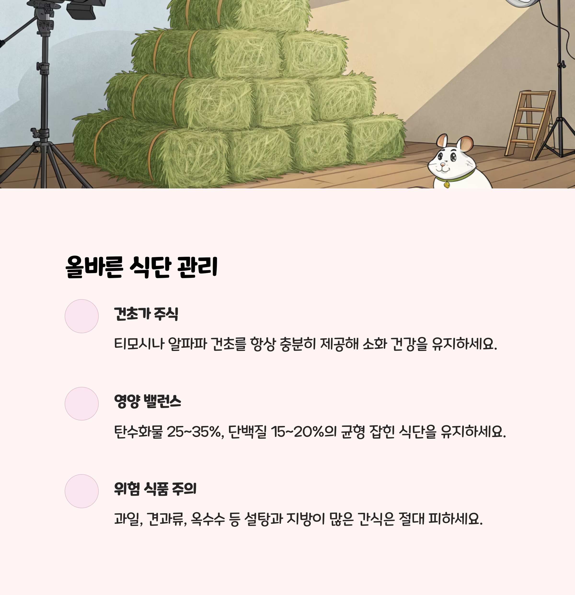 주식은 티모시나 과수원 풀 등 고품질 건초가 필수입니다. 전용 사료는 소량만 보충하고, 로즈힙이나 말린 사과 같은 건강 간식은 가끔만 주세요. 급격한 식단 변화는 소화기 장애를 유발할 수 있으니, 사료를 바꿀 땐 2주간 천천히 섞어서 바꿔주세요.