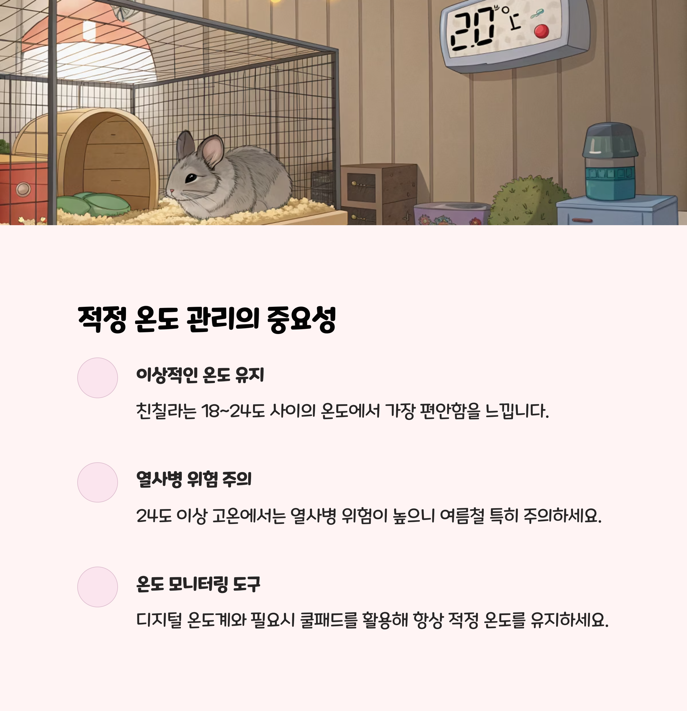 친칠라는 18~24도, 습도 40~60%의 환경에서 가장 건강합니다. 온습도계를 설치하고, 여름철에는 25도 이상 올라가지 않도록 에어컨을 사용하되, 직접 바람은 피하세요. 겨울철에는 가습기를 활용해 건조함을 막아주세요.