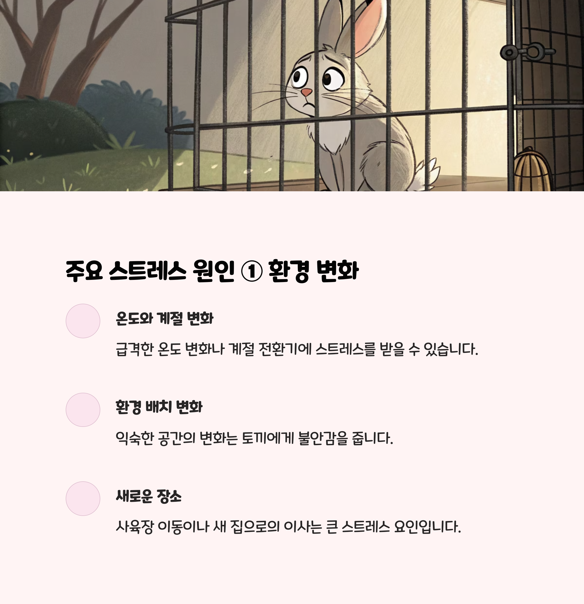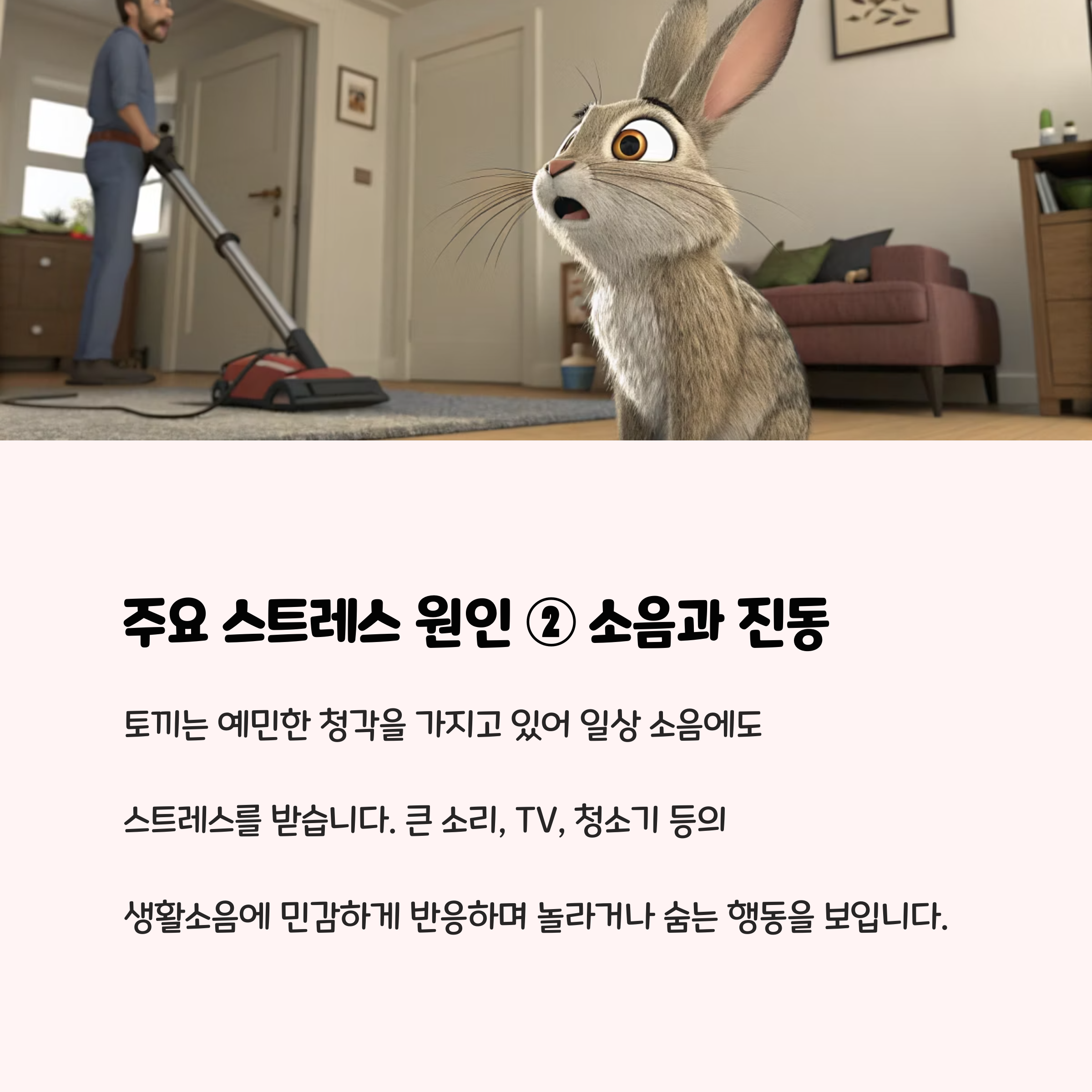- 토끼는 작은 변화에도 민감하게 반응합니다. 케이지 위치를 옮기거나, 새로운 가구를 들이거나, 갑자기 큰 소리가 나는 환경(청소기, TV, 문 쾅 닫는 소리 등)은 토끼에게 큰 스트레스가 됩니다.