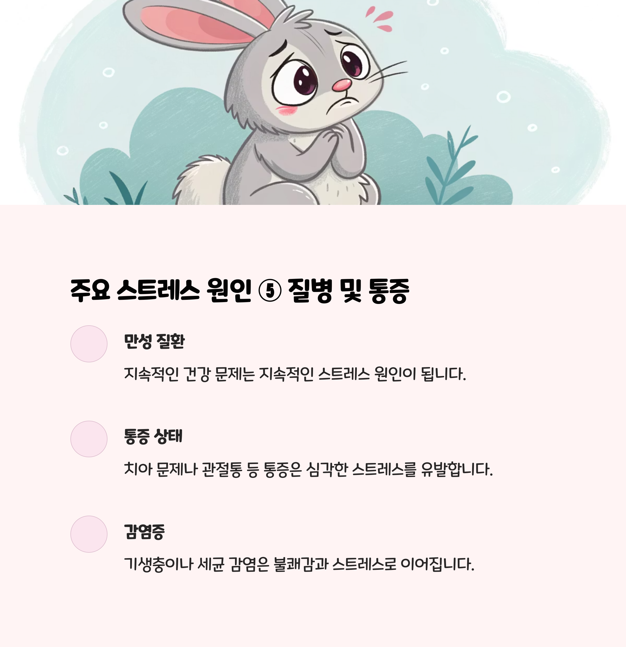 - 치아, 발바닥, 소화기관 등에서 통증이 있거나, 부적절한 식단(과도한 당분, 섬유질 부족 등)은 토끼를 불편하게 해 스트레스를 높입니다.