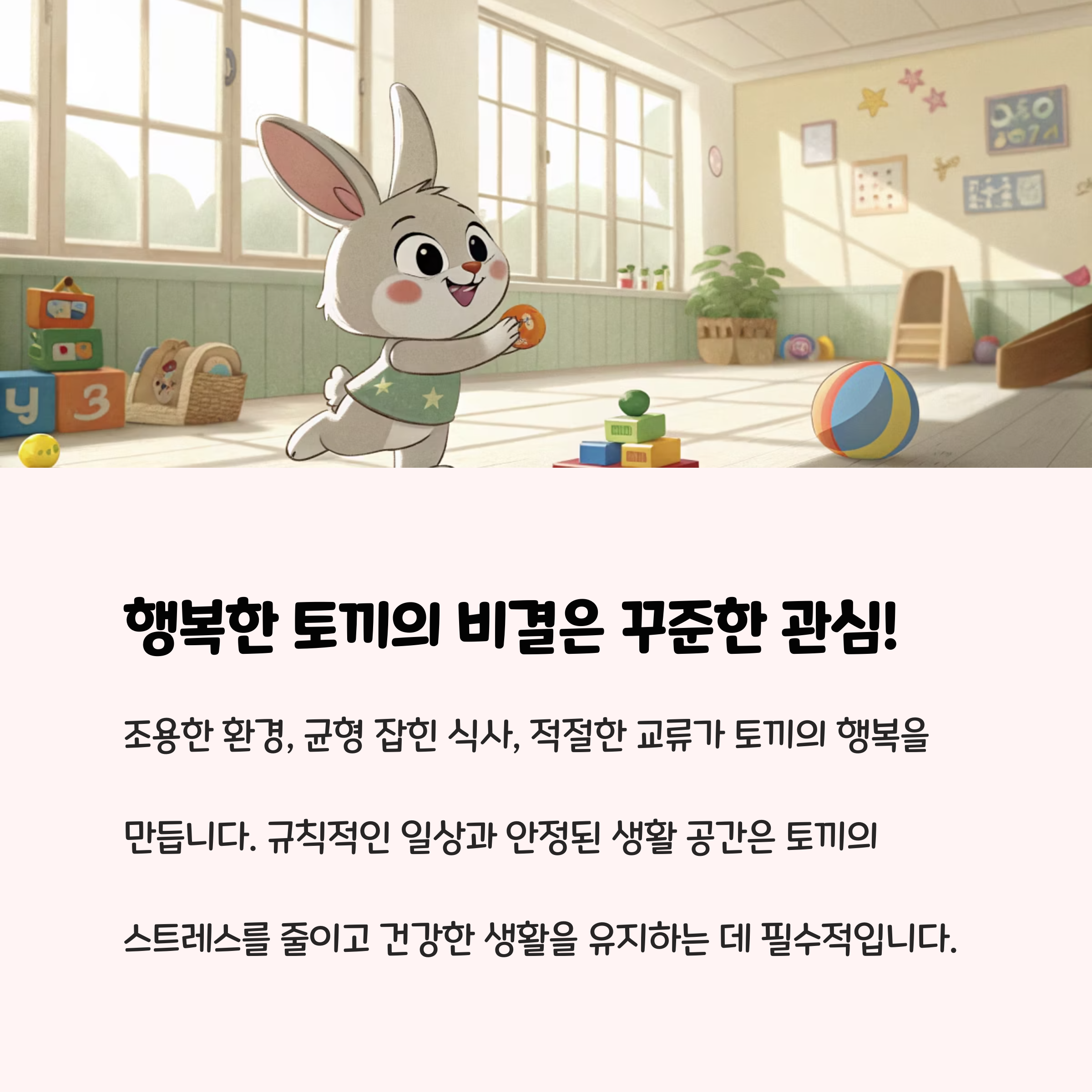 매일 일정 시간 토끼와 교감하세요. 말을 걸거나, 부드럽게 쓰다듬어 주는 것이 신뢰 형성에 큰 도움이 됩니다. 장난감이나 터널, 운동장을 활용해 호기심을 충족시켜주면 지루함에서 오는 스트레스를 줄일 수 있습니다.