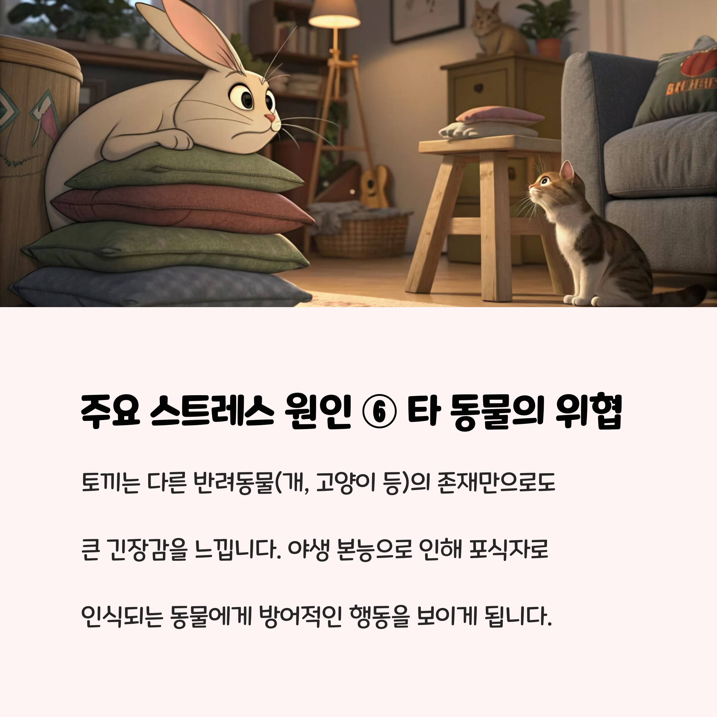 - 고양이, 개 등 포식 동물의 존재나 소리만으로도 토끼는 극심한 불안을 느끼며, 실제로 스트레스 호르몬(코르티솔) 수치가 2배 이상 증가한다는 연구 결과도 있습니다.