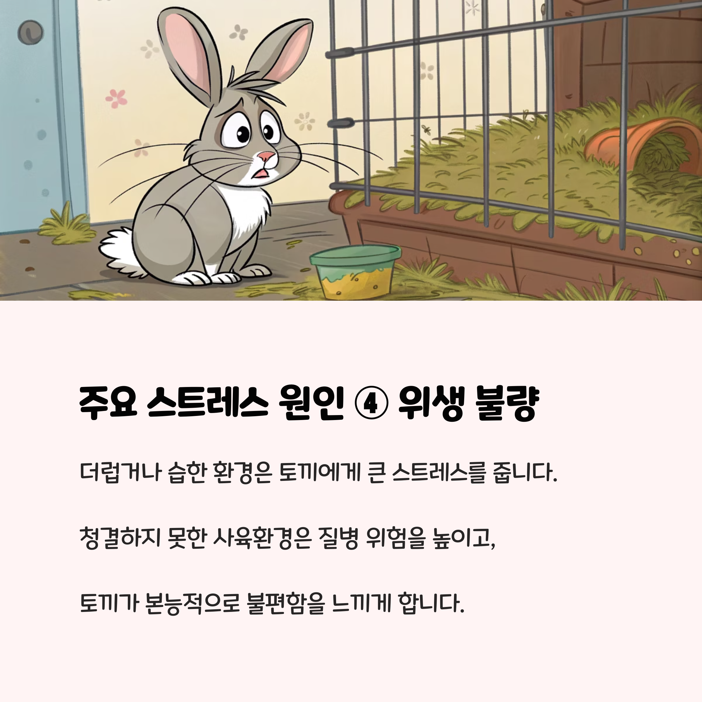 - 더러운 화장실, 신선하지 않은 건초, 강한 냄새(향수, 담배, 생선구이 등)는 토끼의 후각을 자극해 불쾌감과 스트레스를 유발합니다.
