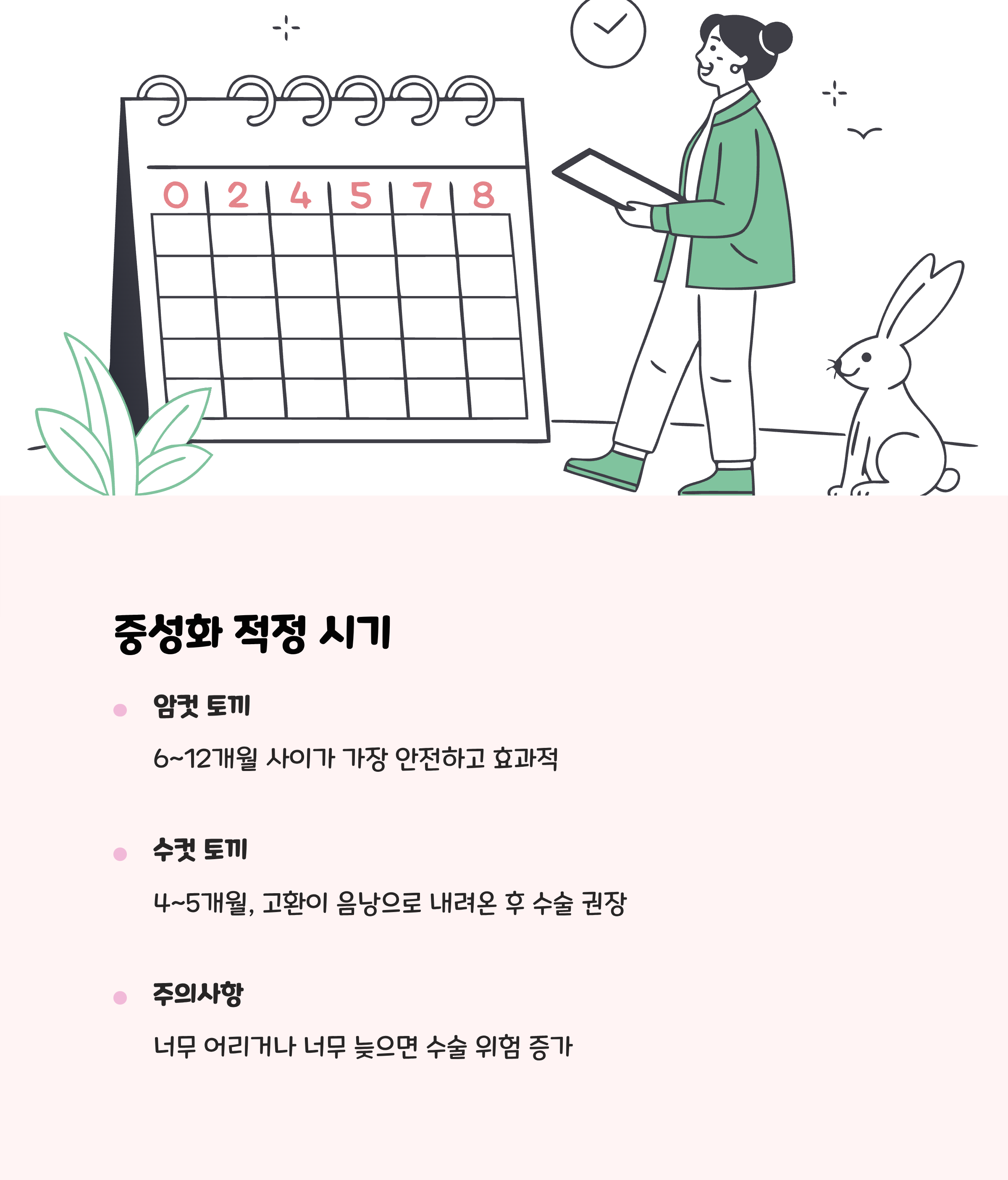 | 적정 수술 시기 | 암컷: 6~12개월 / 수컷: 5개월 전후 | - |
