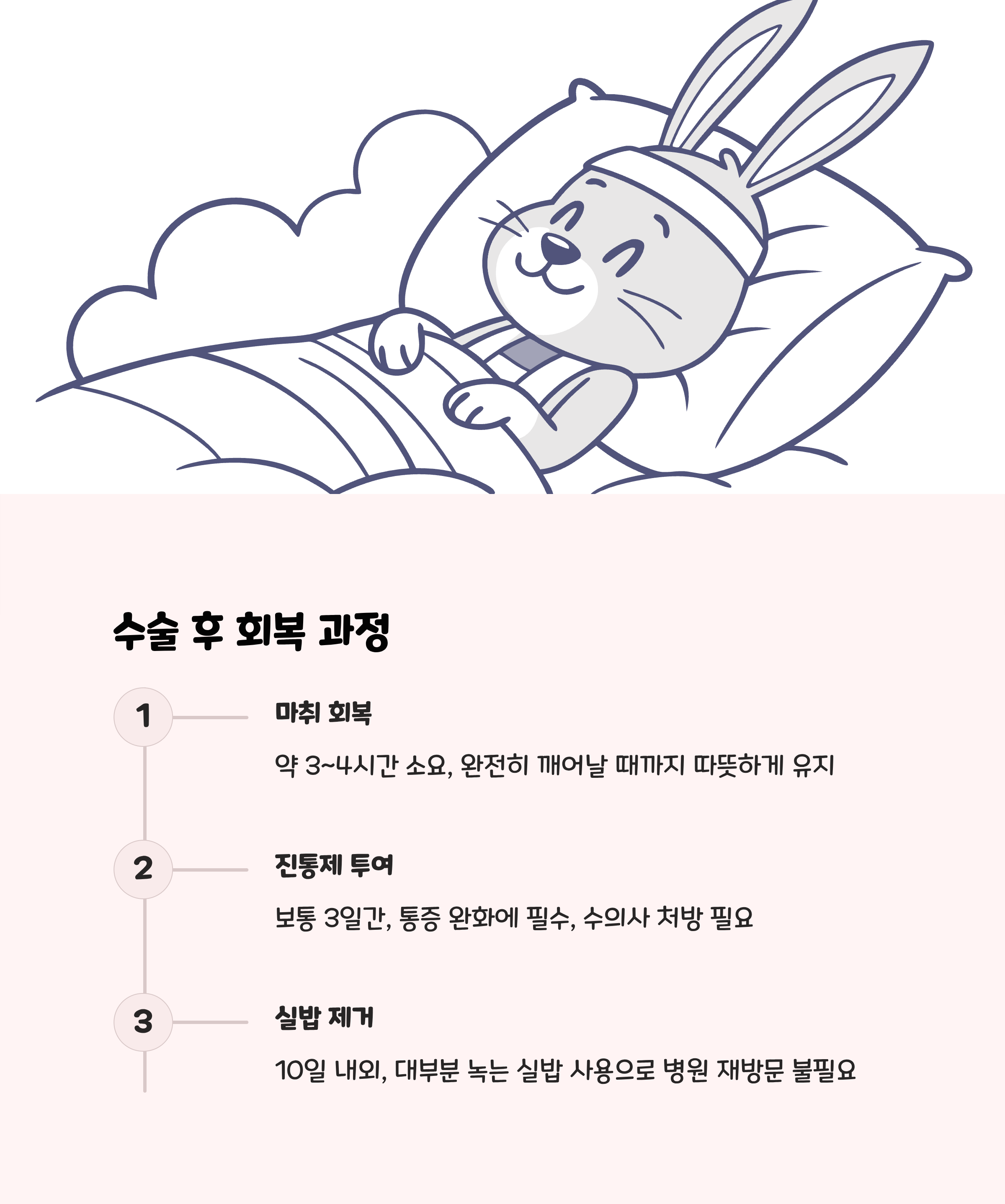| 수술 후 관리 | 식욕 회복 관찰, 수술 부위 청결 유지 | 3일 뒤 붕대 제거 권장 |