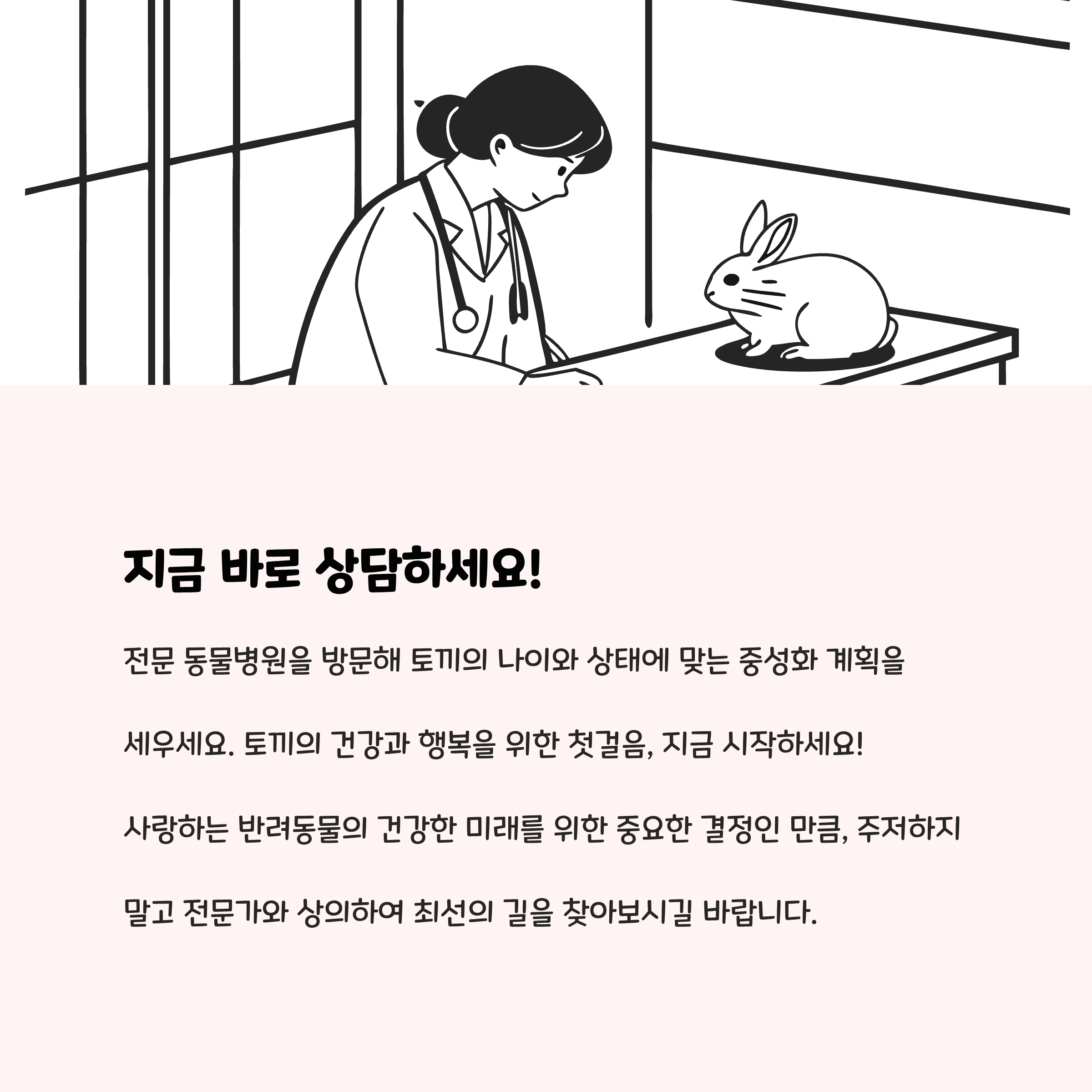 토끼 중성화수술은 단순히 임신 예방 이상의 건강 관리법입니다. 적절한 시기에 수술을 받아 질병을 예방하고 스트레스를 줄이는 한편, 수술 전후 철저한 관리로 회복을 원활히 할 수 있습니다. 비용이나 과정에 대해 병원과 상세히 상담하시고, 토끼가 편안히 회복할 수 있게 세심한 도움을 주시길 권해드립니다.