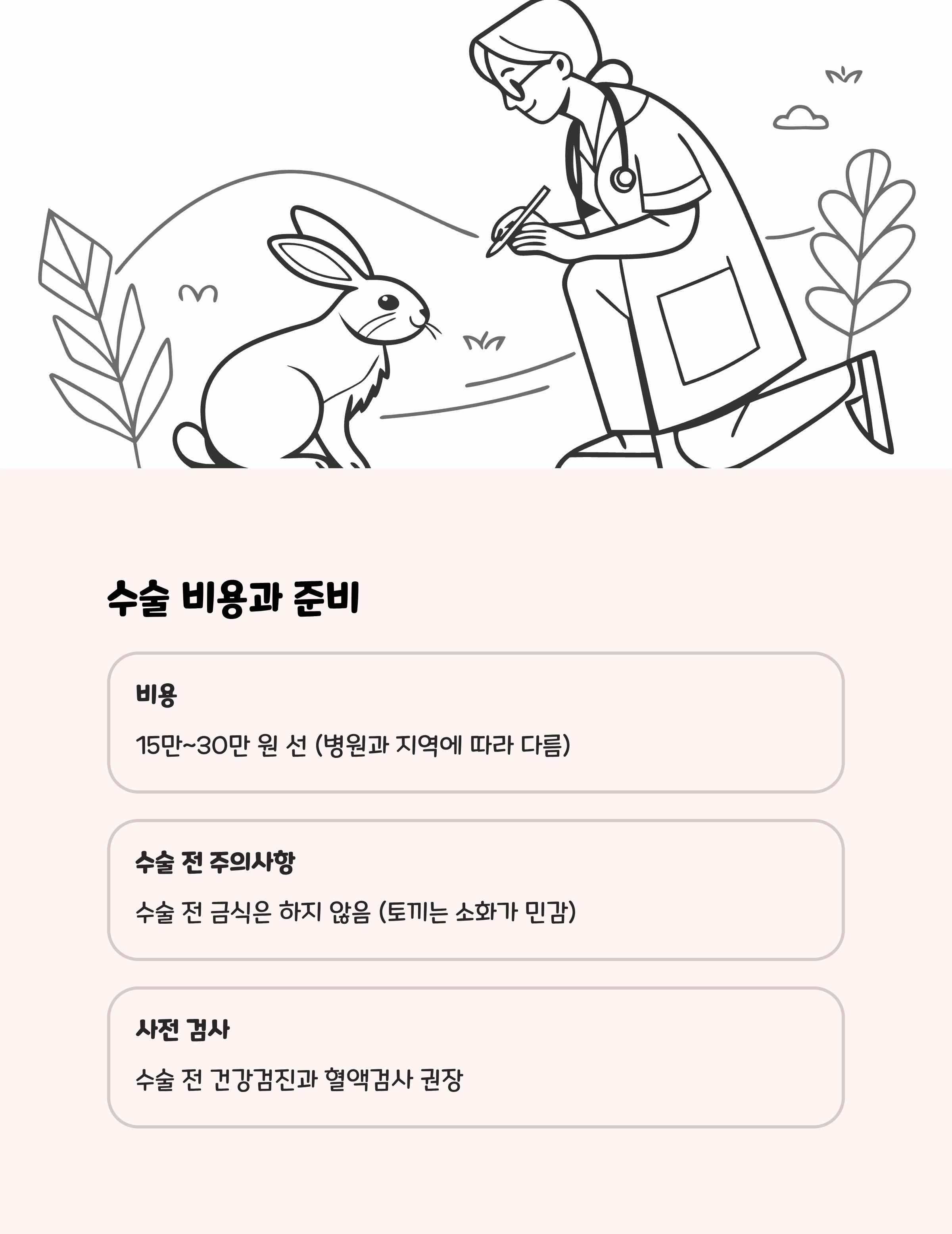 | 수술 형태 | 암컷: 개복수술, 수컷: 고환 제거 수술 | 병원별 상이, 15만~30만 원 내외 |