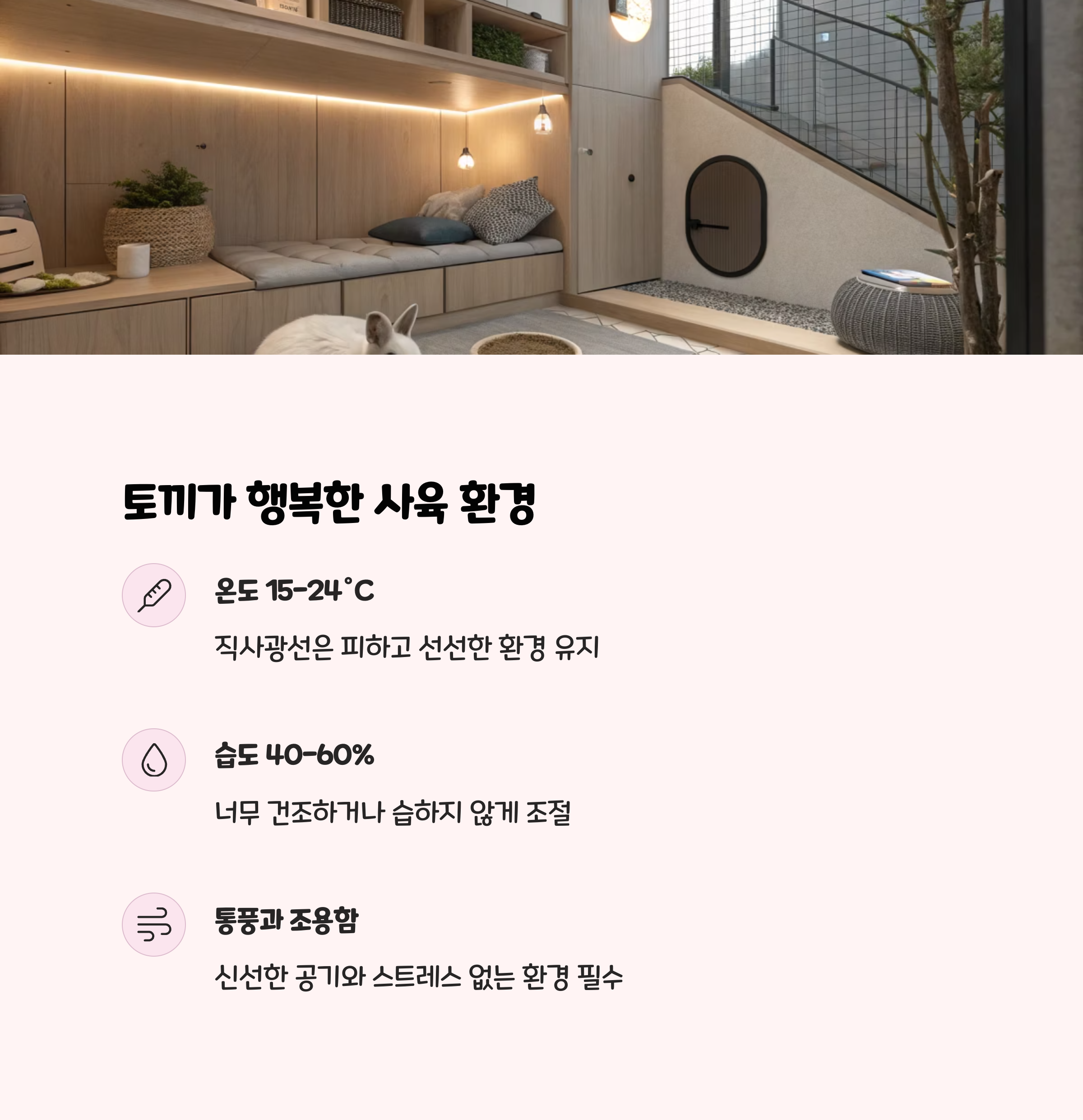 토끼는 환경 변화에 매우 민감합니다. 적정 온도는 16~22℃, 습도는 40~60%가 이상적이며, 더위에 특히 약하므로 여름철 온도 관리에 신경 써야 합니다.