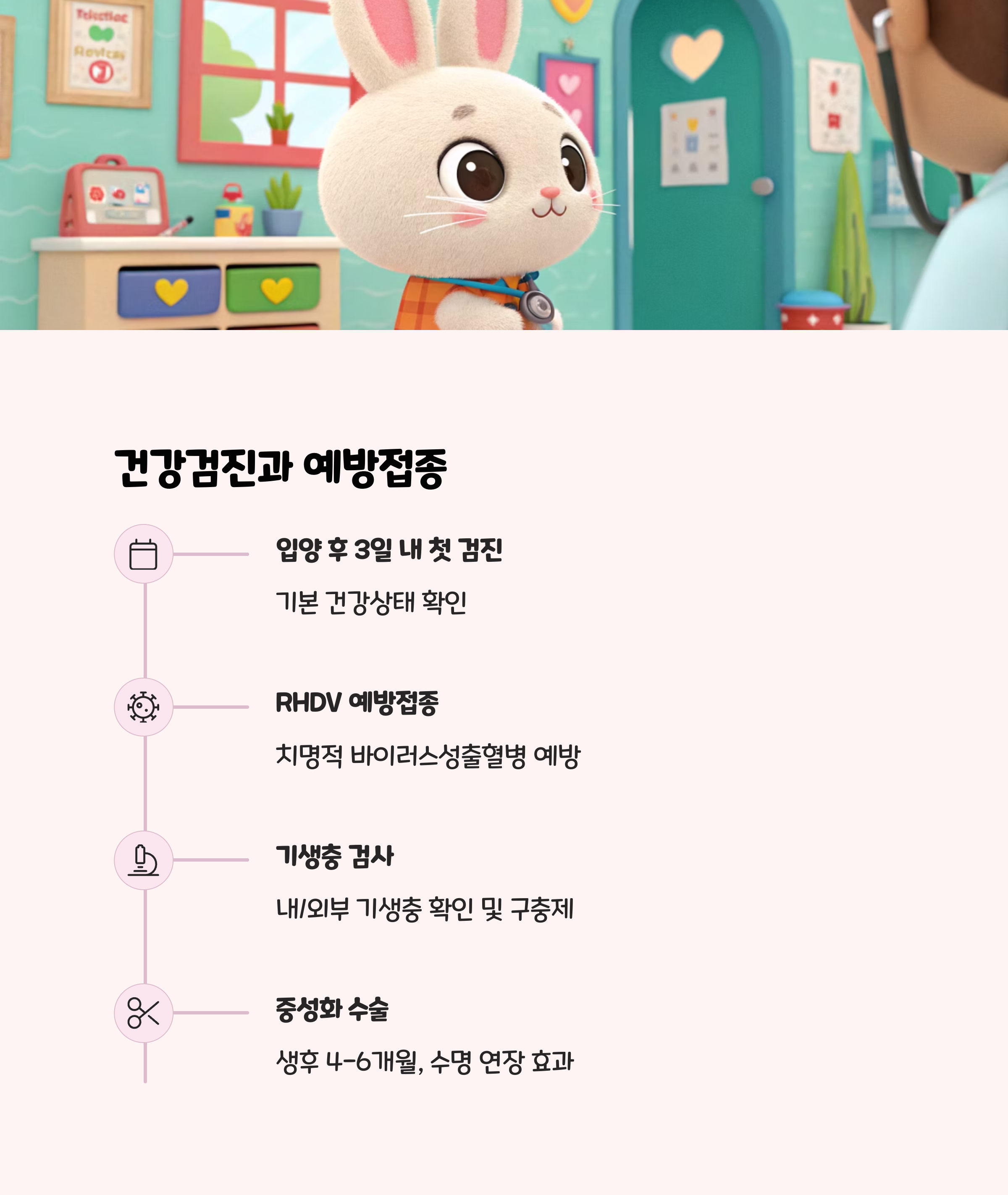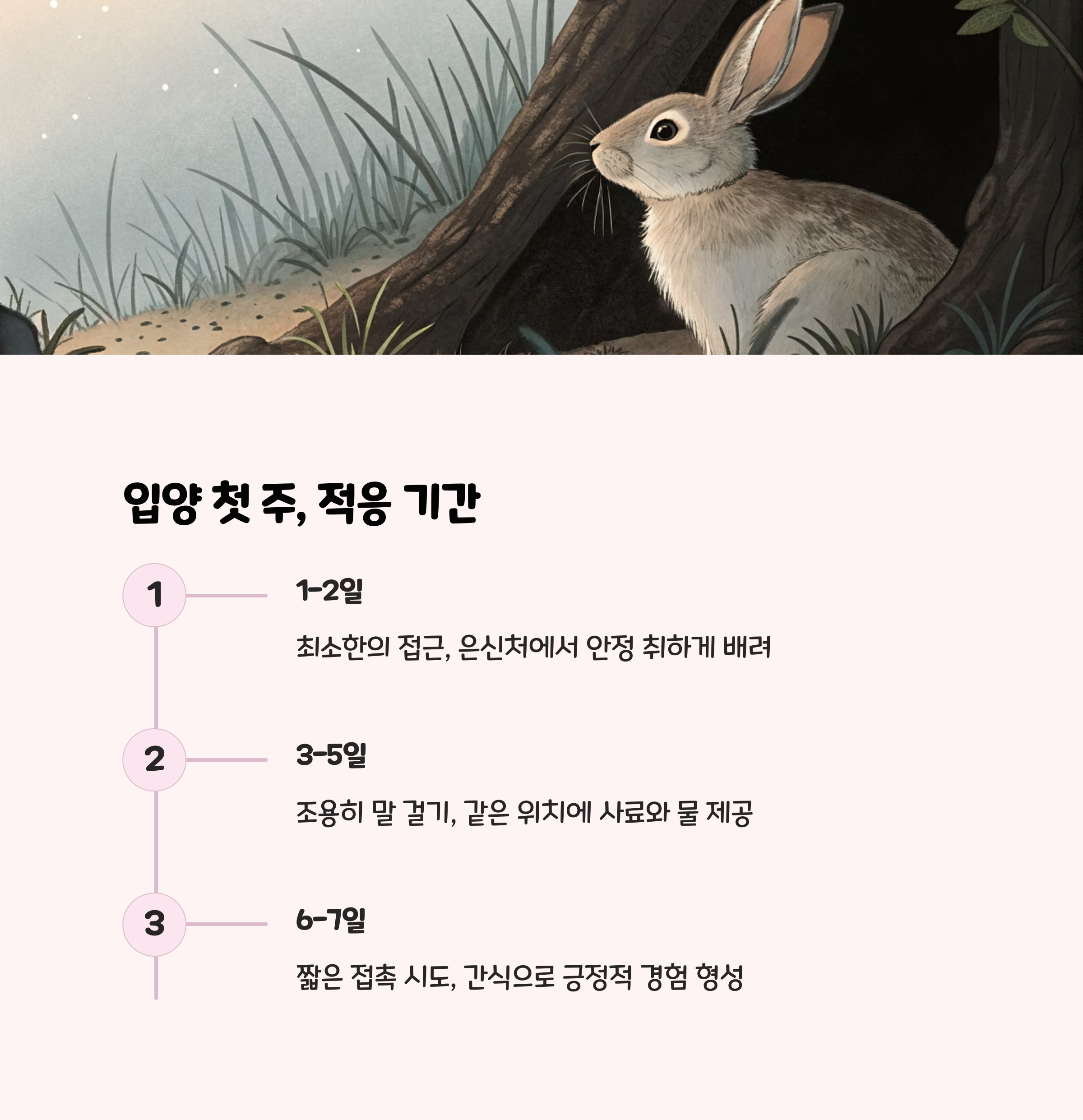 - 입양 초기 2주간은 과도한 접촉을 피하고, 토끼가 스스로 환경에 적응할 수 있도록 기다려주세요.