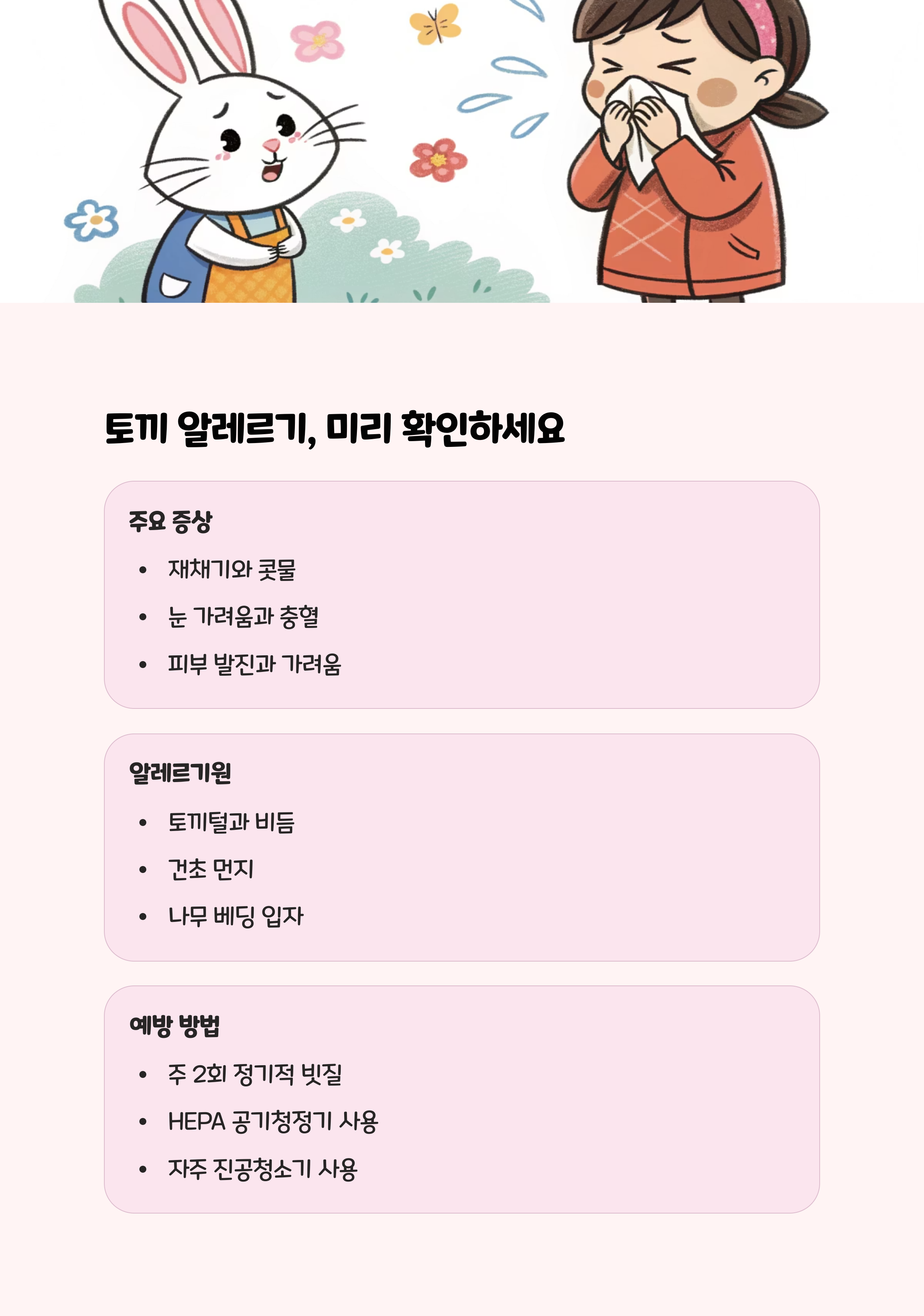 - 알레르기 주의: 가족 중 알레르기 체질이 있다면, 입양 전 알레르기 검사를 권장합니다. 토끼와 목초, 베딩에서 알레르기 반응이 나타날 수 있습니다.