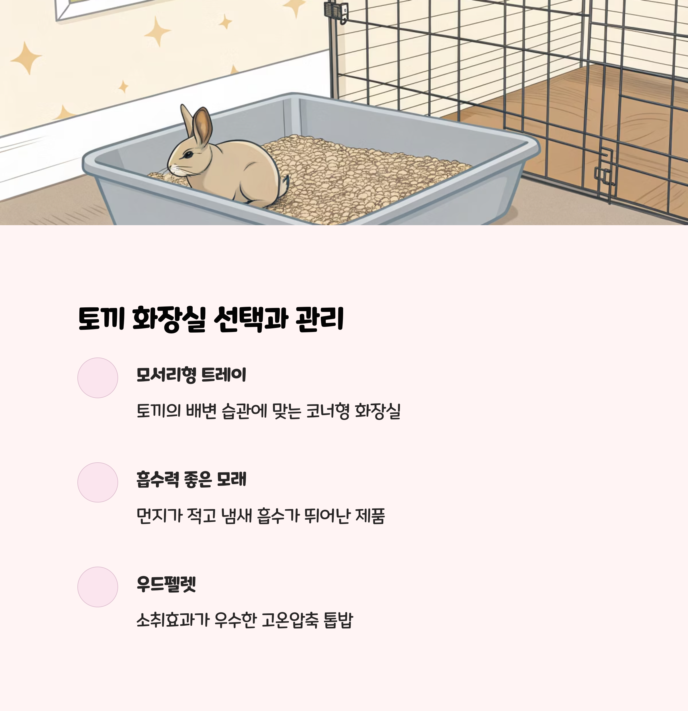 | 화장실/모래 | 우드펠렛 등 천연 모래 사용, 매일 청소 |