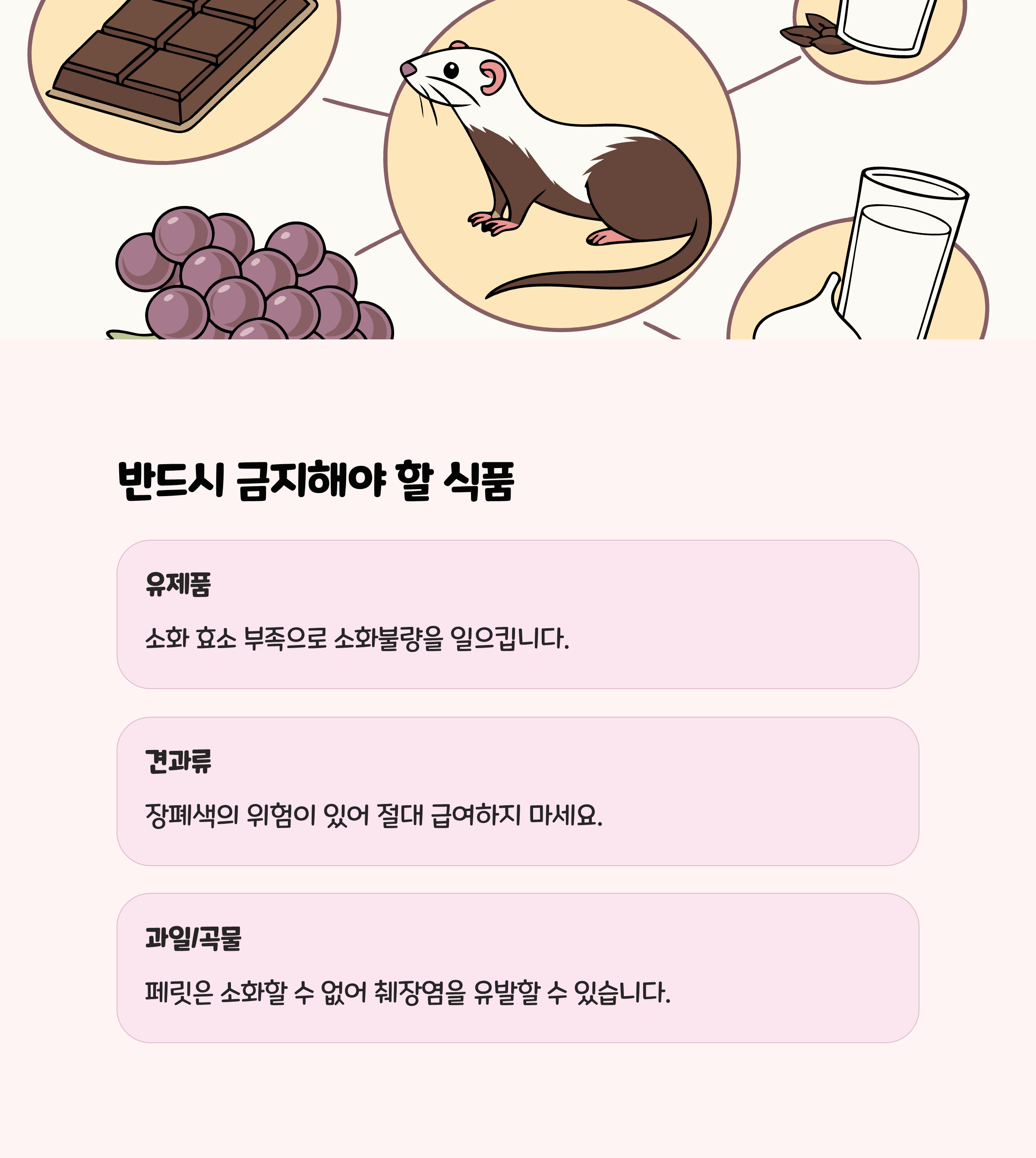 | 슈퍼마켓 유가공품 | 절대 금지 | 우유, 치즈 등 | 페릿은 유당불내성,급여 금지 |