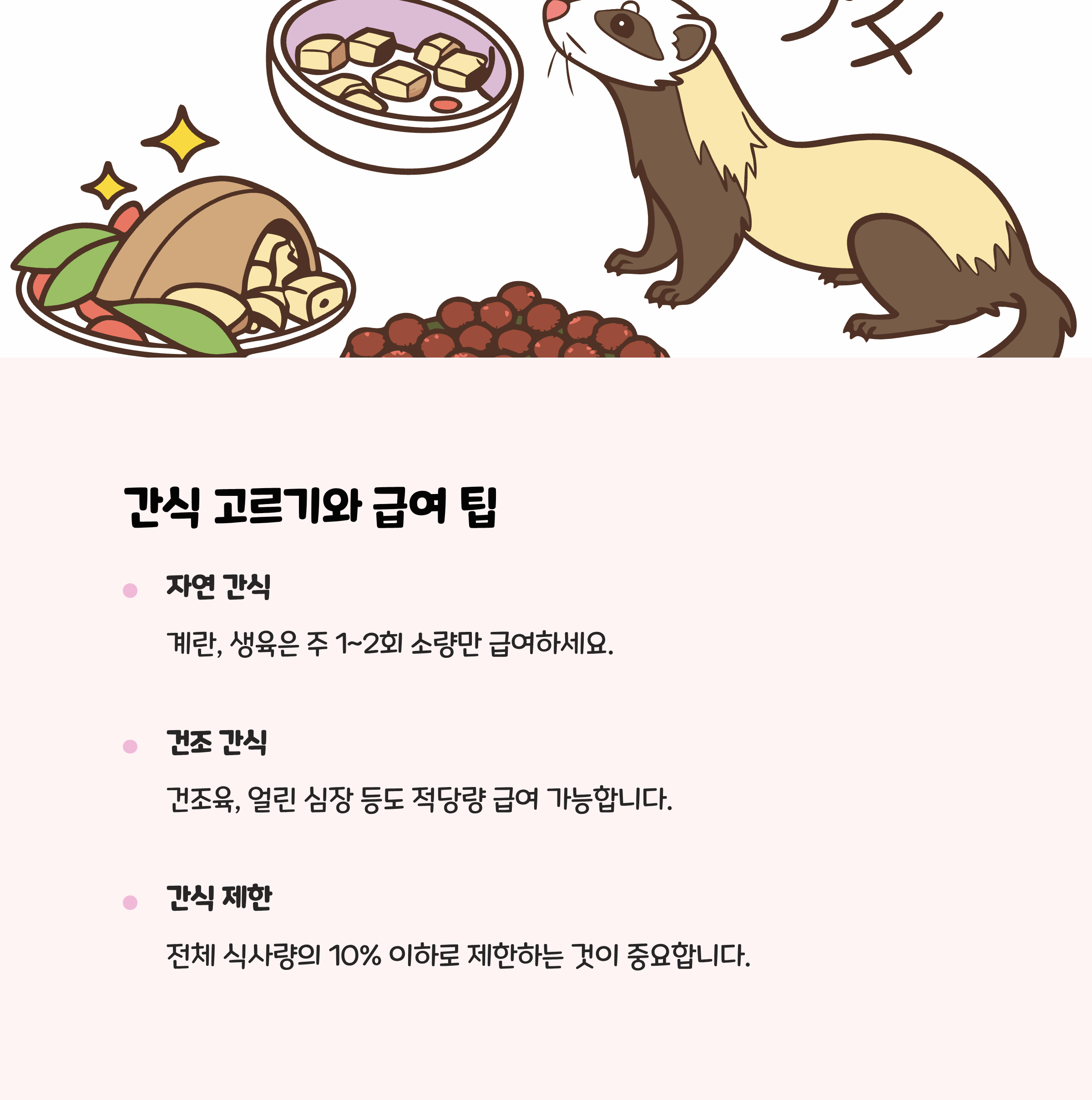 페릿을 키우다 보면, 사료와 간식 선택, 그리고 급여 방법에 대해 수많은 정보 속에서 혼란을 겪게 됩니다. 특히 ‘신선한 자연식’을 제공하려는 보호자분들이 많아졌지만, 정확한 영양성분과 급여법, 주의할 점까지 한눈에 알기란 쉽지 않은 게 현실이죠. 이번 포스팅에서는 최신 정보를 바탕으로, 안심하고 참고할 수 있는 신선사료와 천연 간식 추천, 그리고 꼭 알아야 할 급여 주의사항을 안내해 드리겠습니다.