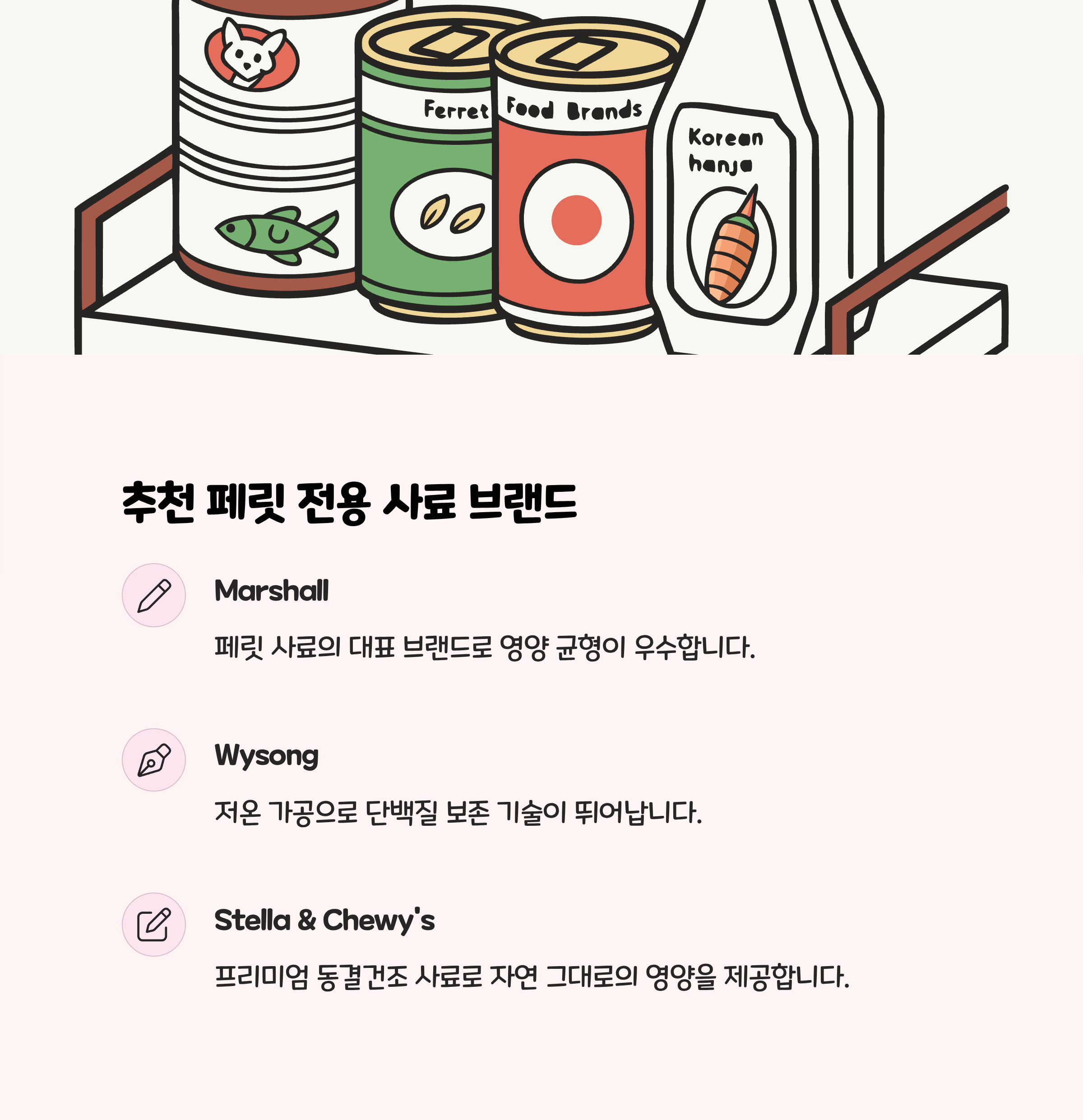 | 동결건조/캔 신선사료 | 추천 | 스텔라&츄이, Evanger’s 등 |