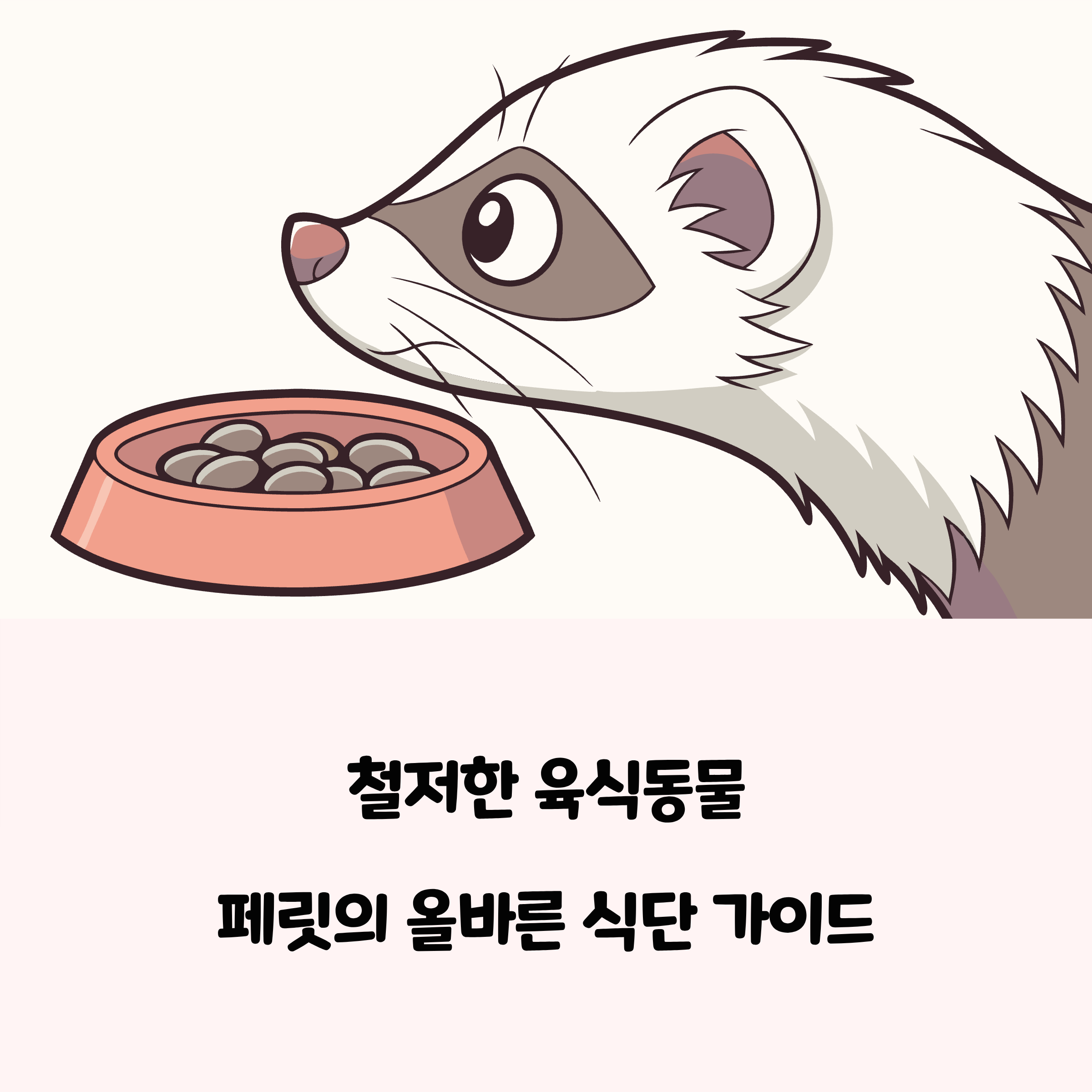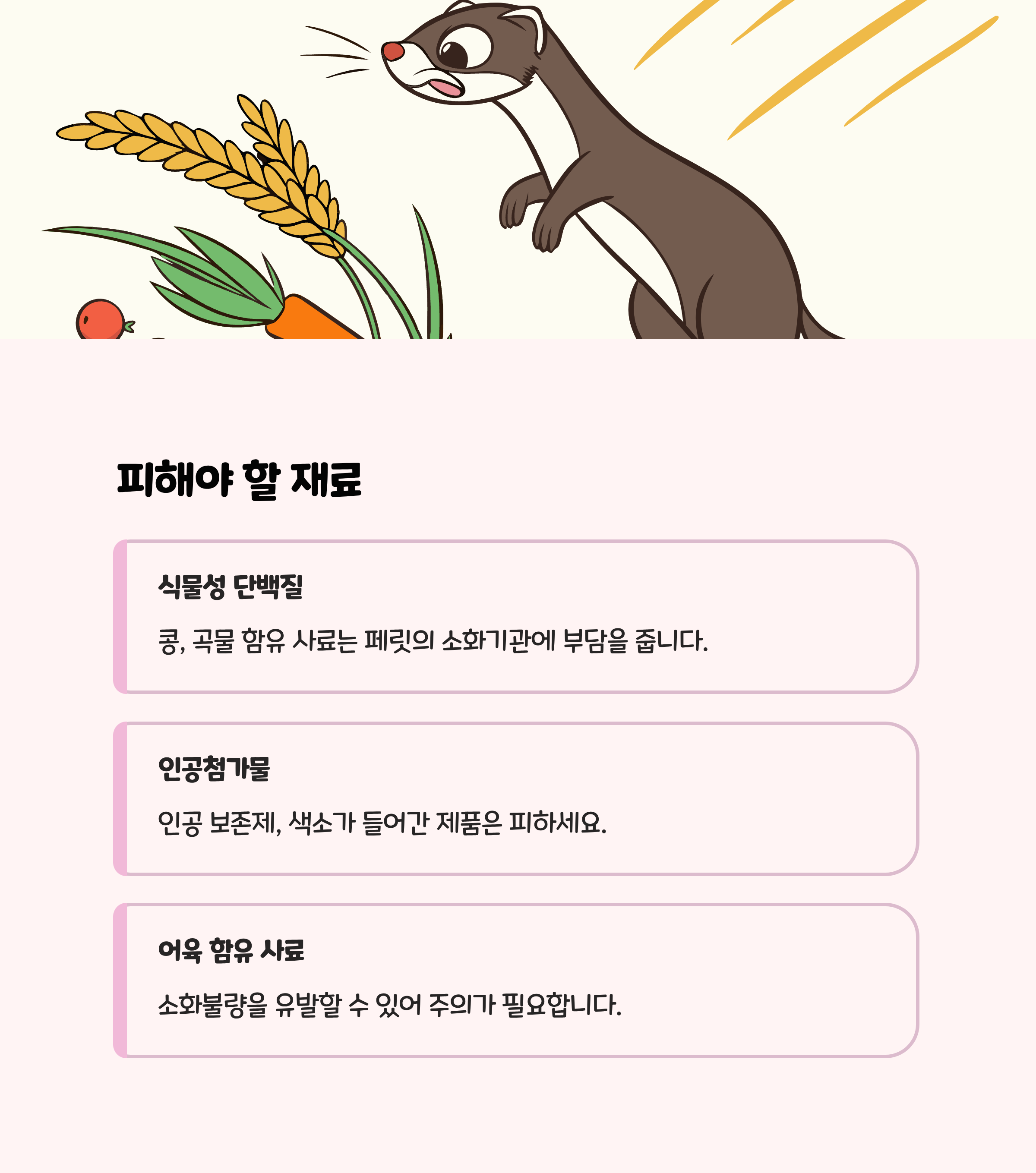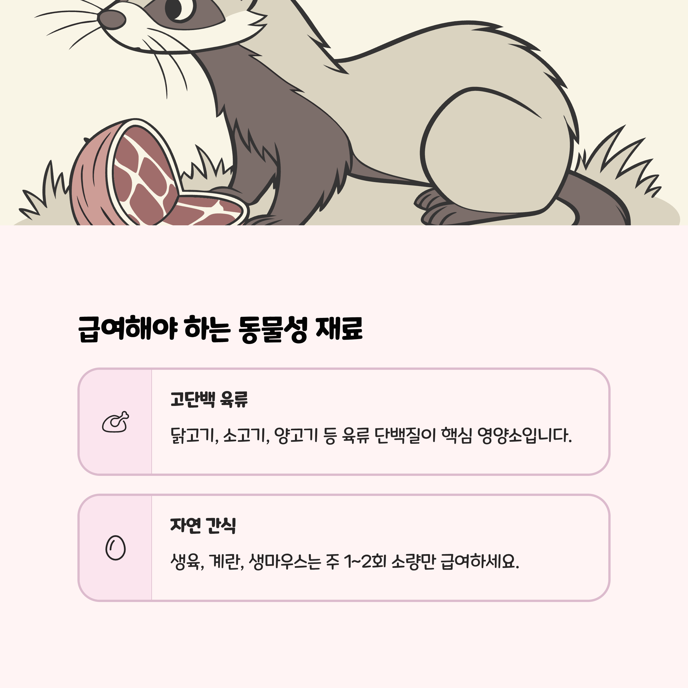 위 내용은 미국수의사회(American Veterinary Medical Association), 미국 페릿협회(American Ferret Association)와 같은 국제적 전문기관, 그리고 국내외 수의학 전문 병원인 NC State Veterinary Hospital, Arizona Exotics Veterinary Clinic 등에서 발표한 ‘페릿 영양 권장 기준과 안전 급여법’에 근거해 정리한 것입니다.