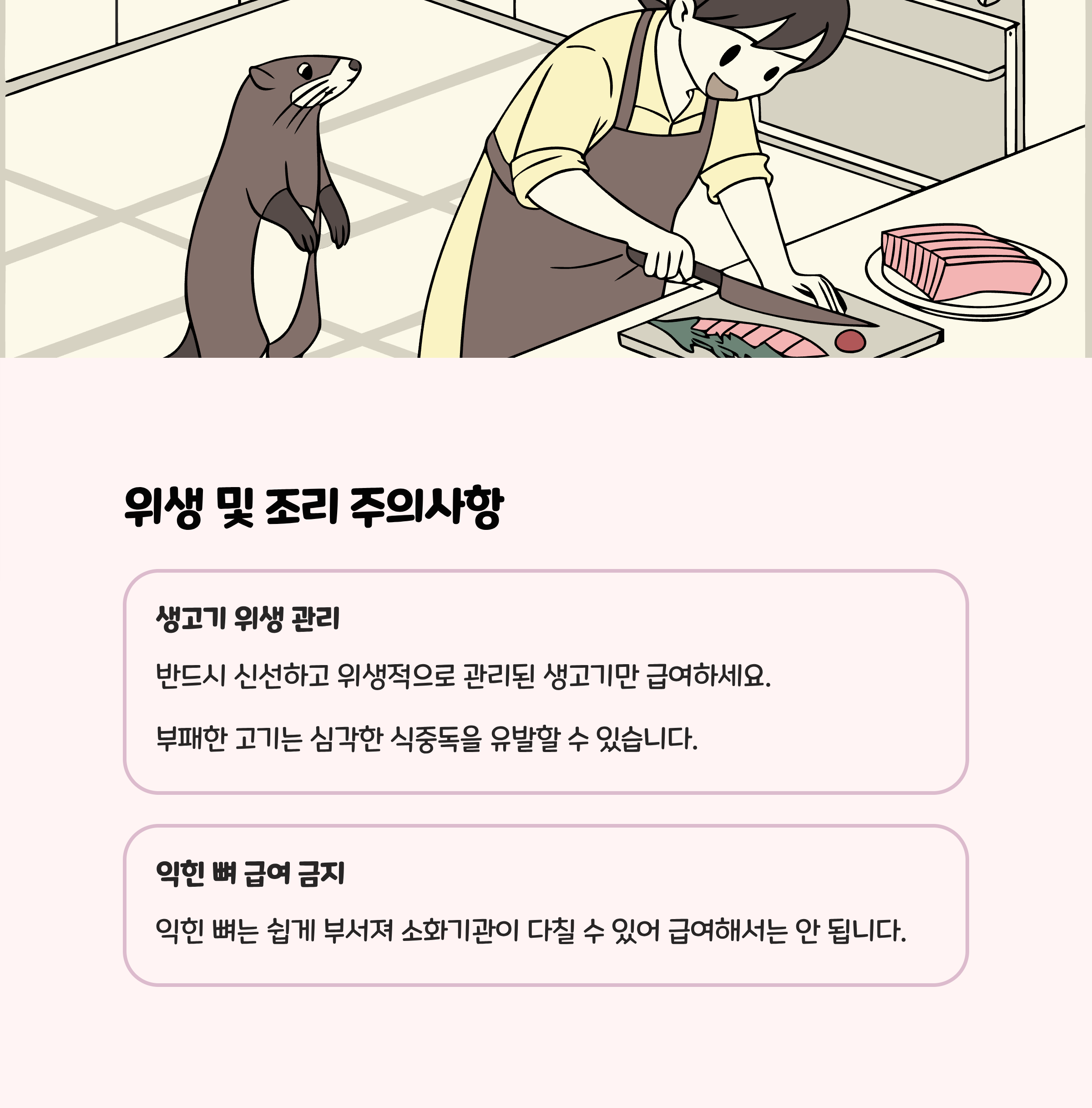 날고기/생뼈 급여 시 위생 철저: 식중독, 살모넬라 등 위험. 신선육만 사용, 남은 음식은 1~2시간 내 바로 폐기- 생뼈는 익히지 말고, 꼭 ‘포장된 동물전용’으로 준비: 익힌 뼈는 부러져 위험
