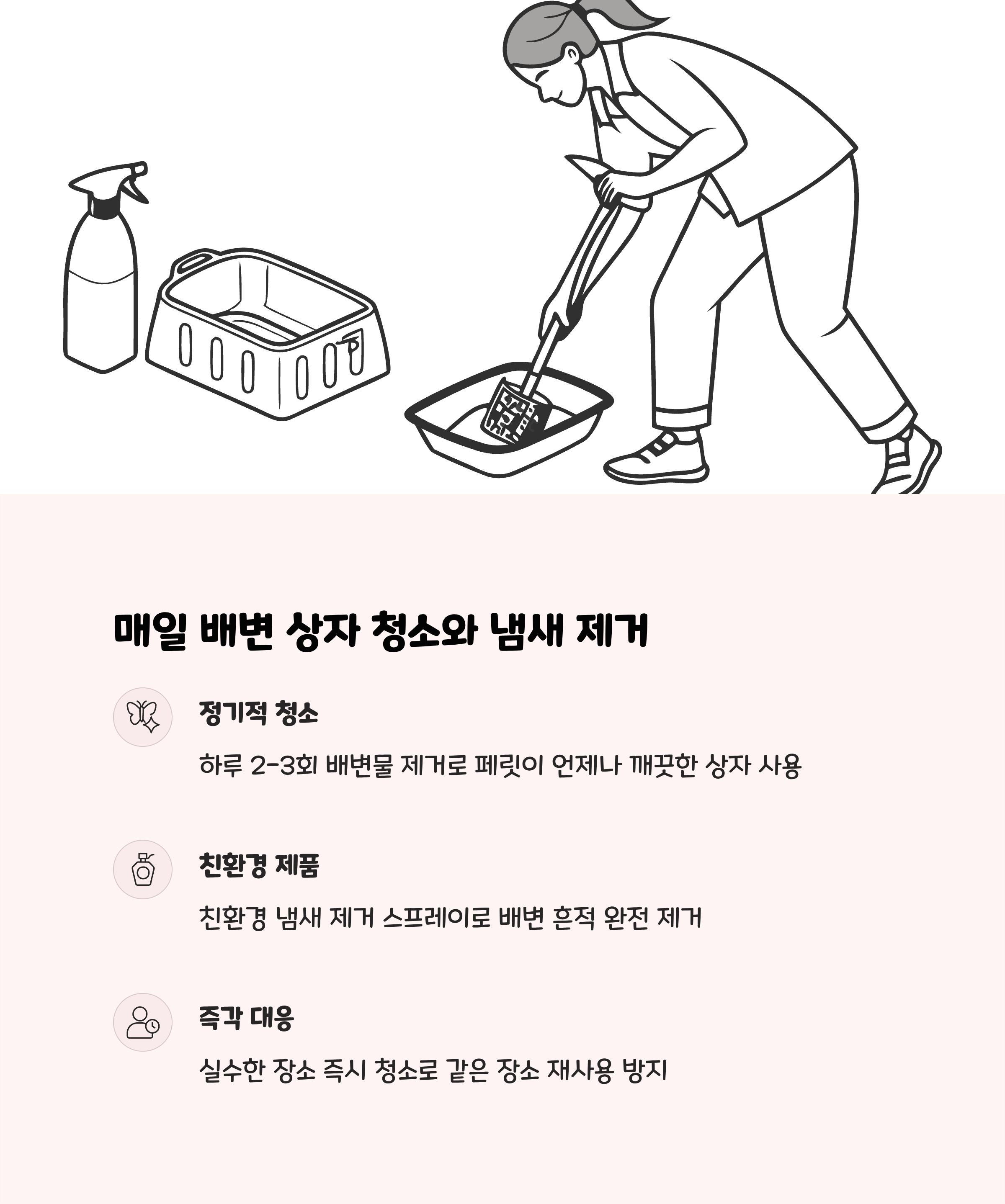 꾸준히 반복해 습관화 시켜야 합니다. - 배변 상자를 매일 청소하고, 정기적으로 모래를 교체해 항상 깨끗한 환경을 유지하는 것이 중요합니다.