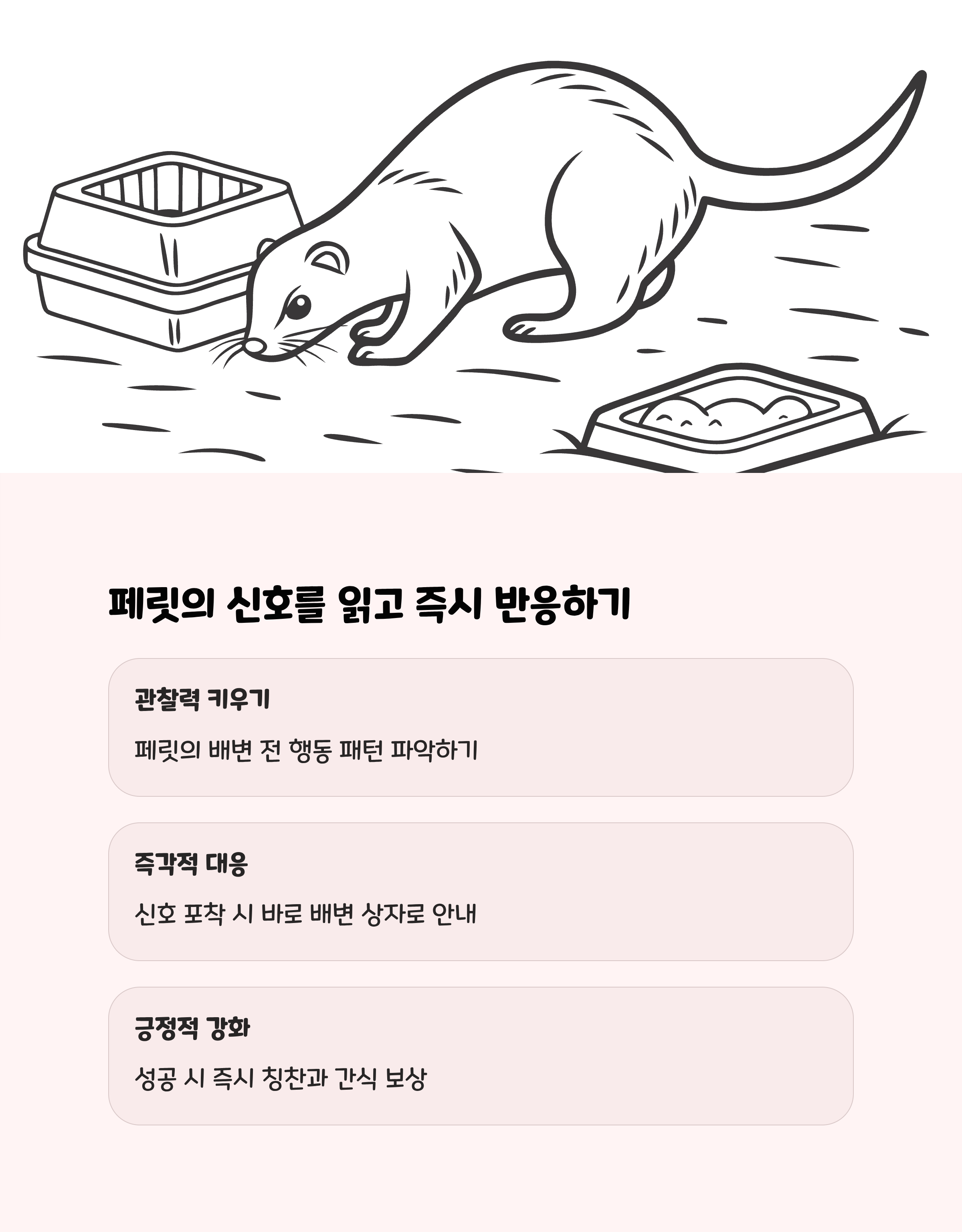 페릿은 배변 전 냄새 맡기, 뒤로 걷기 같은 행동을 하므로 이를 관찰해 즉시 배변 상자로 안내해야 합니다.
