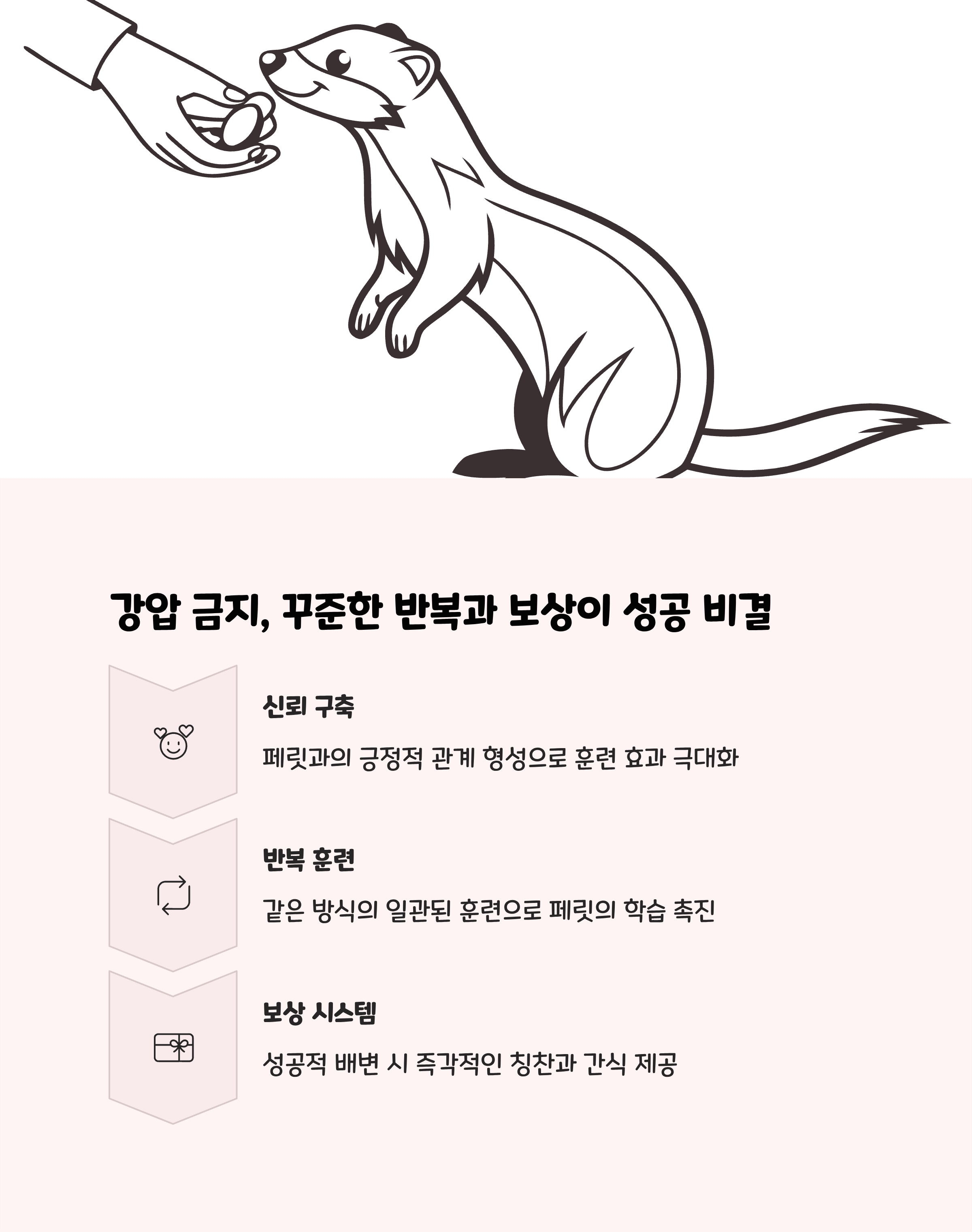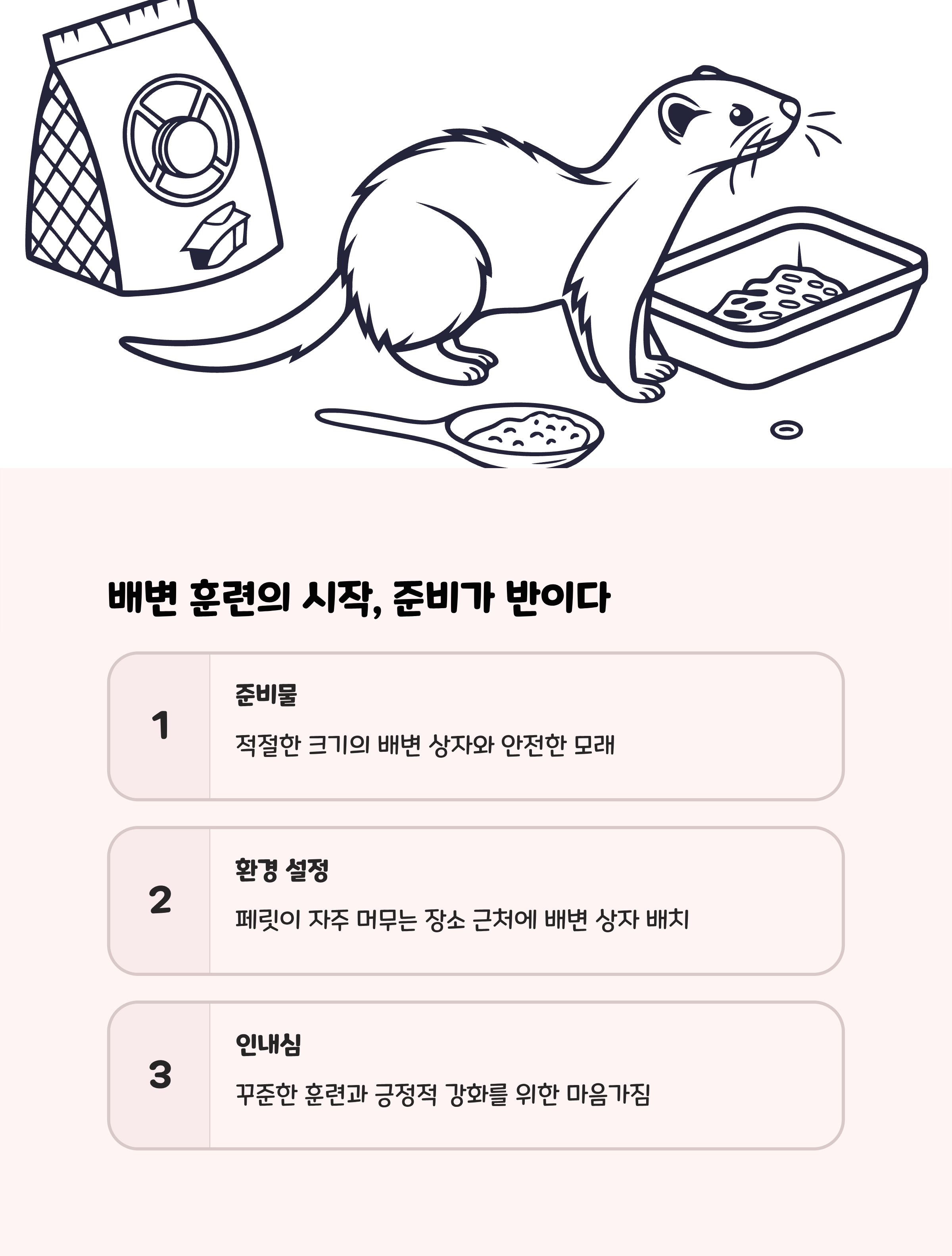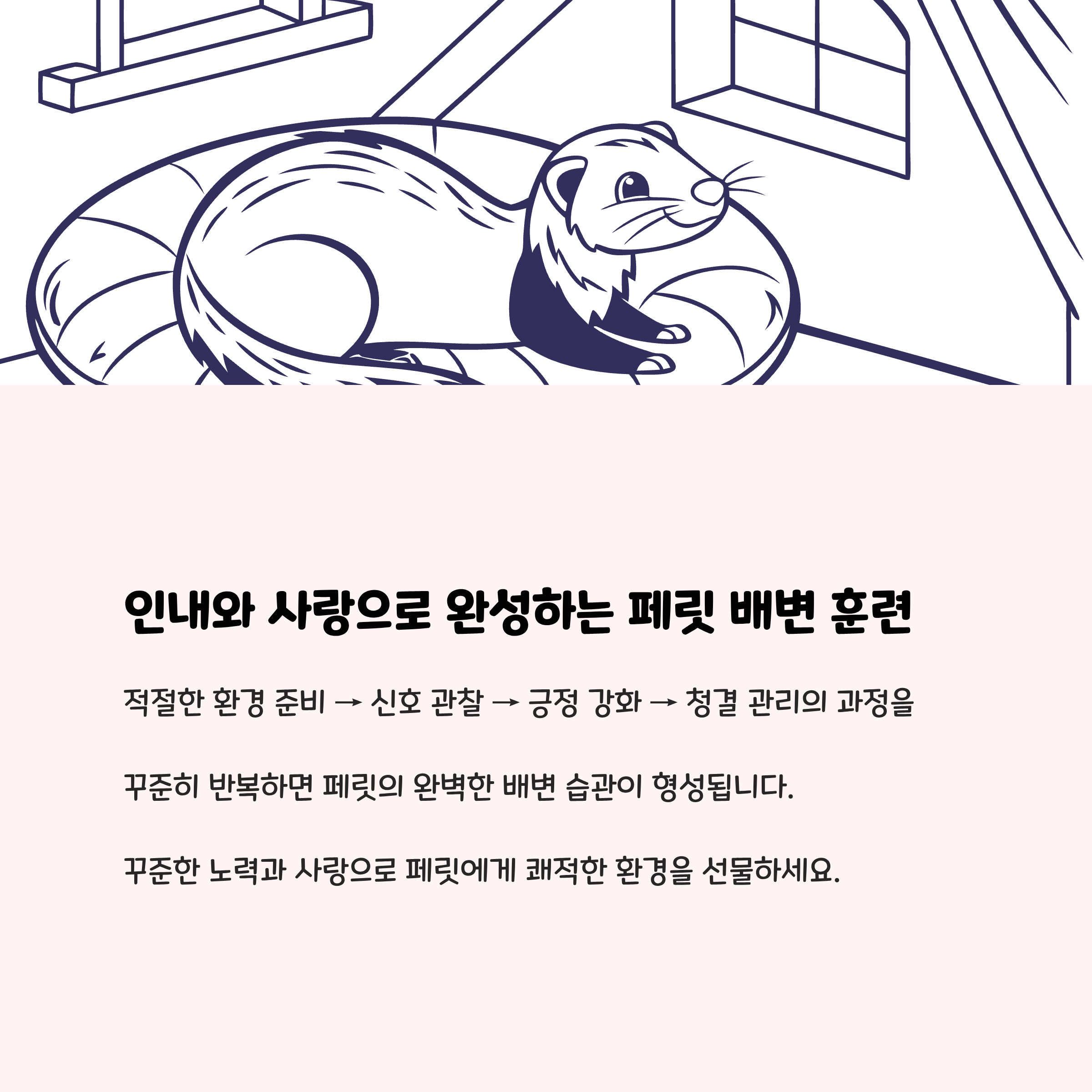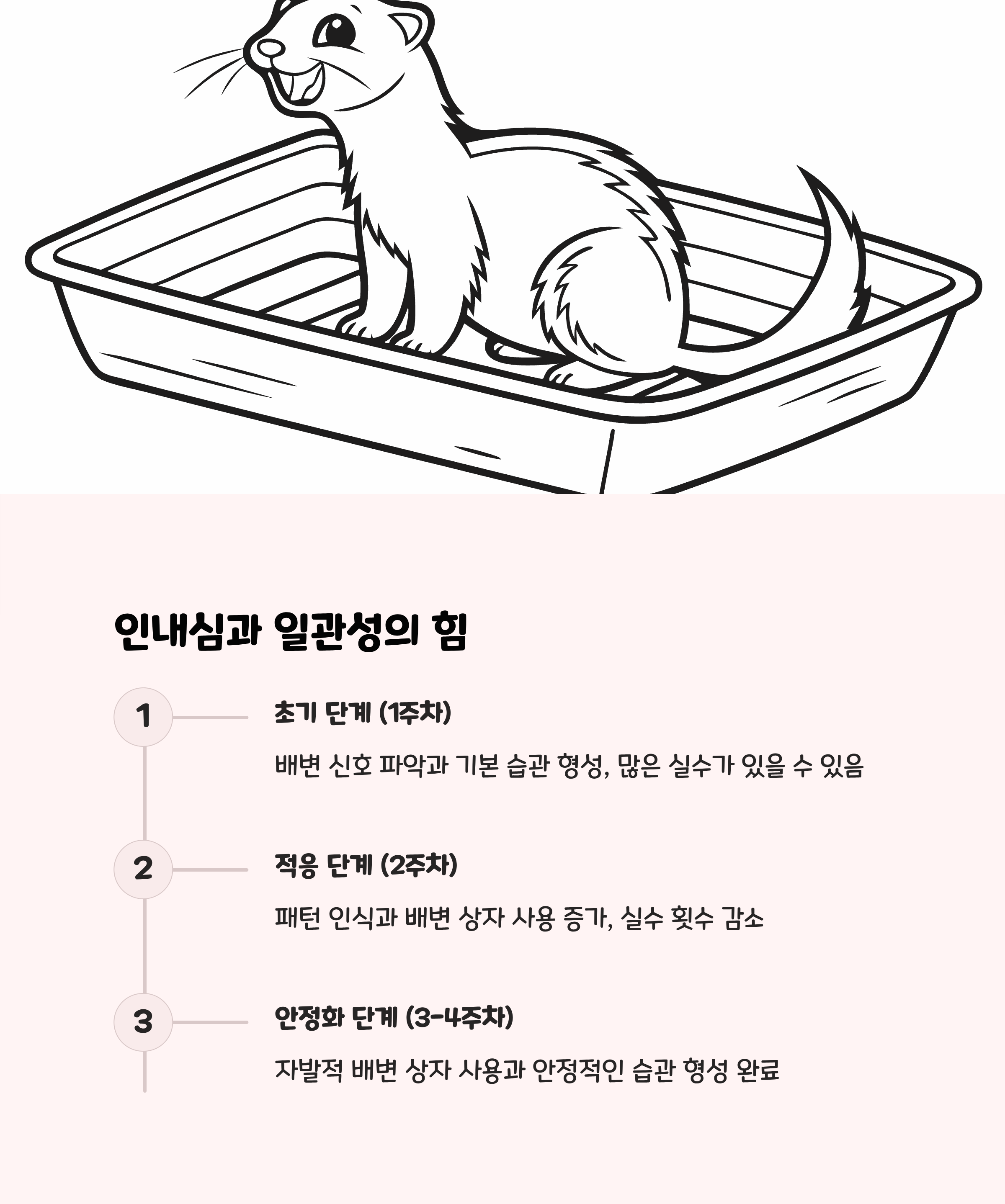 | 5단계 - 문제 행동 대응 | 실수 장소 청소 및 접근 차단, 보상 시 실제 배변 여부 확인 | 강압 금지, 페릿 개별 성향에 맞춘 훈련법 적용 |