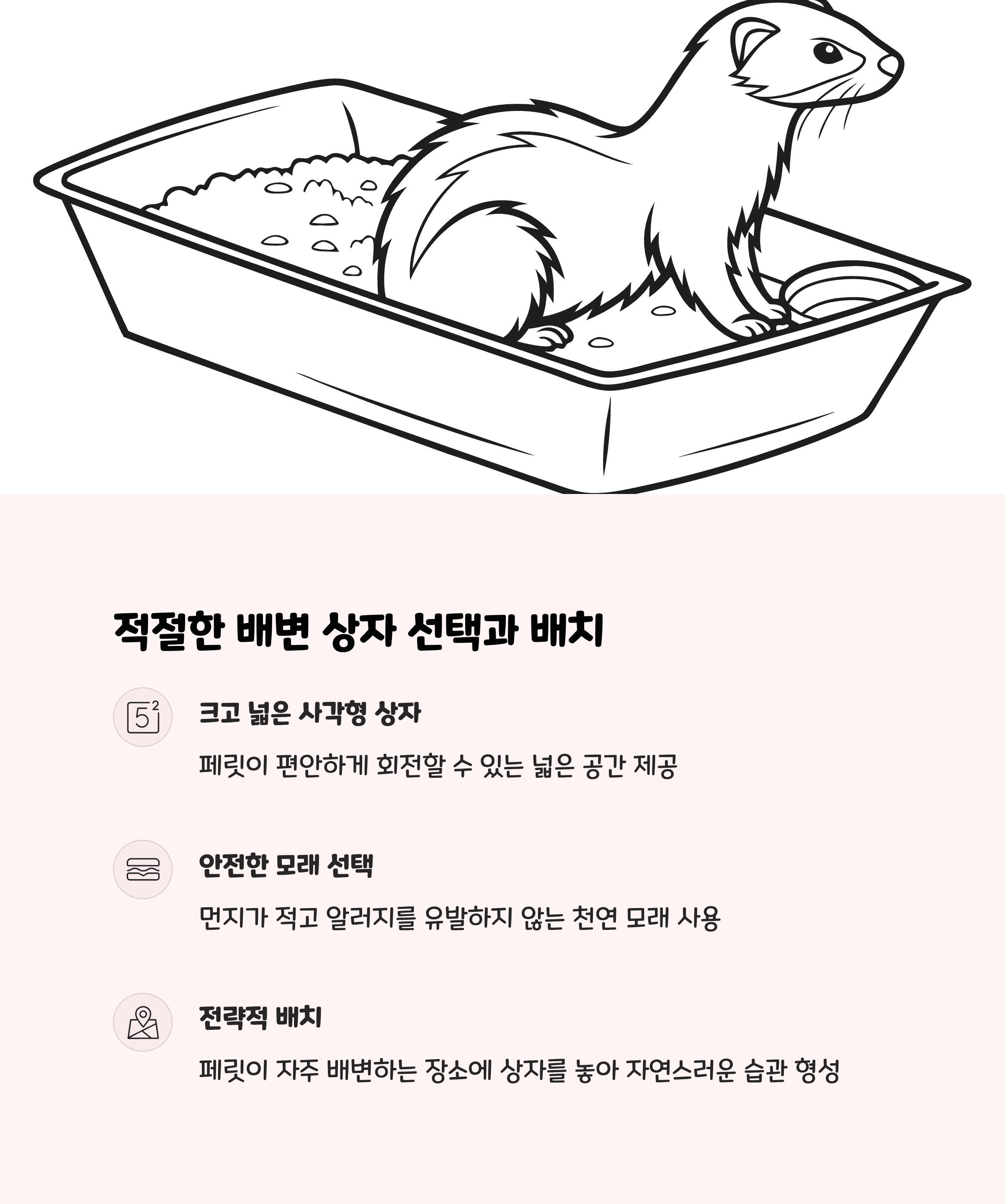 배변 상자는 낮은 입구로 페릿이 쉽게 드나들 수 있어야 하며, 코너형이 공간 활용에 좋습니다. 먼지가 없고 화학 첨가물이 없는 모래를 사용하는 것이 안전합니다.