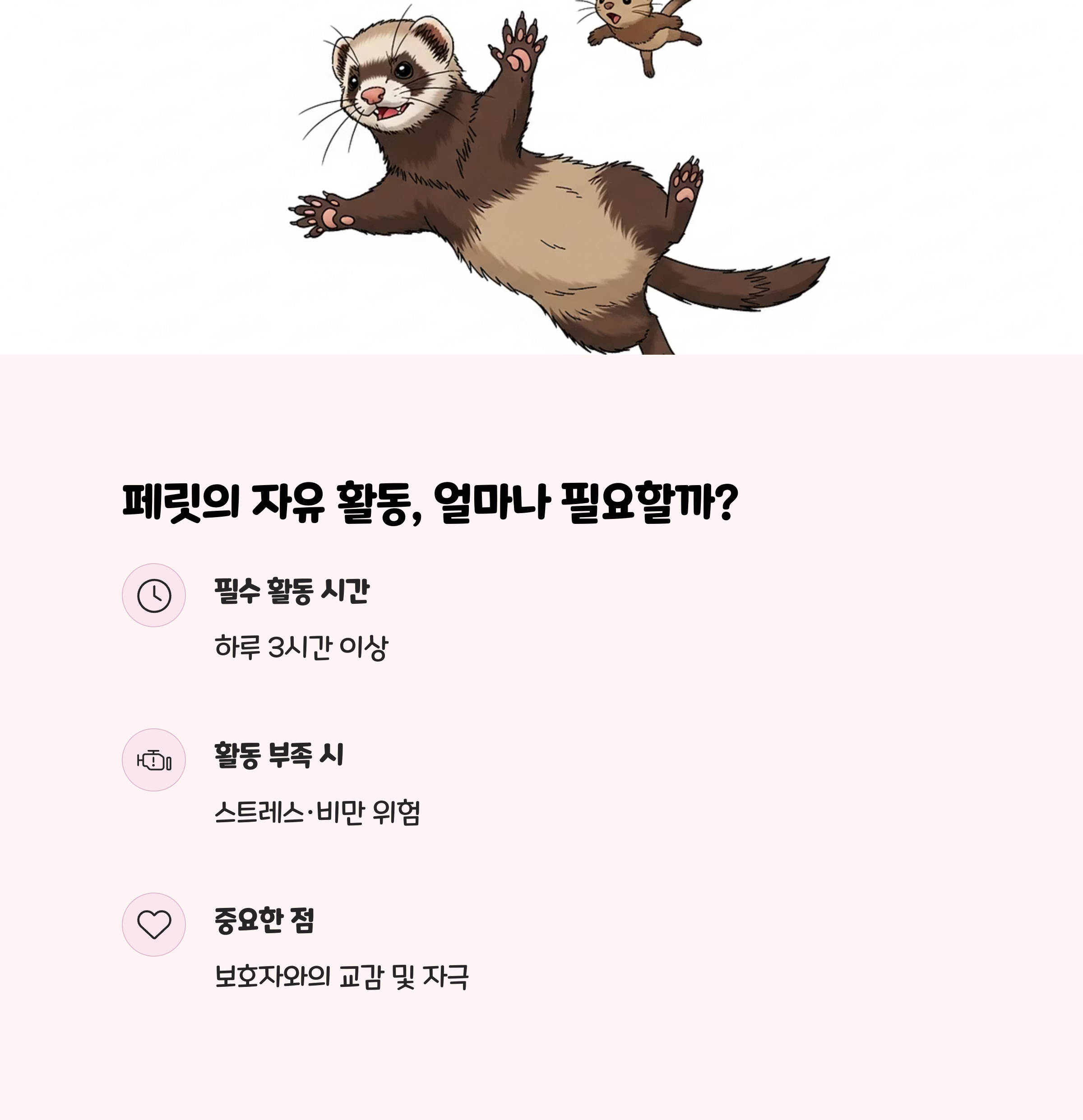 하루 2회 이상 힘든 놀이와 충분한 교감이 요구됩니다. 외출이 잦거나 시간이 부족한 환경이라면 주의가 필요합니다. - 타 동물, 아이들과의 사회성 교육도 중요하며, 페릿은 외로움을 많이 타는 동물이므로 깊은 교감이 필요합니다.