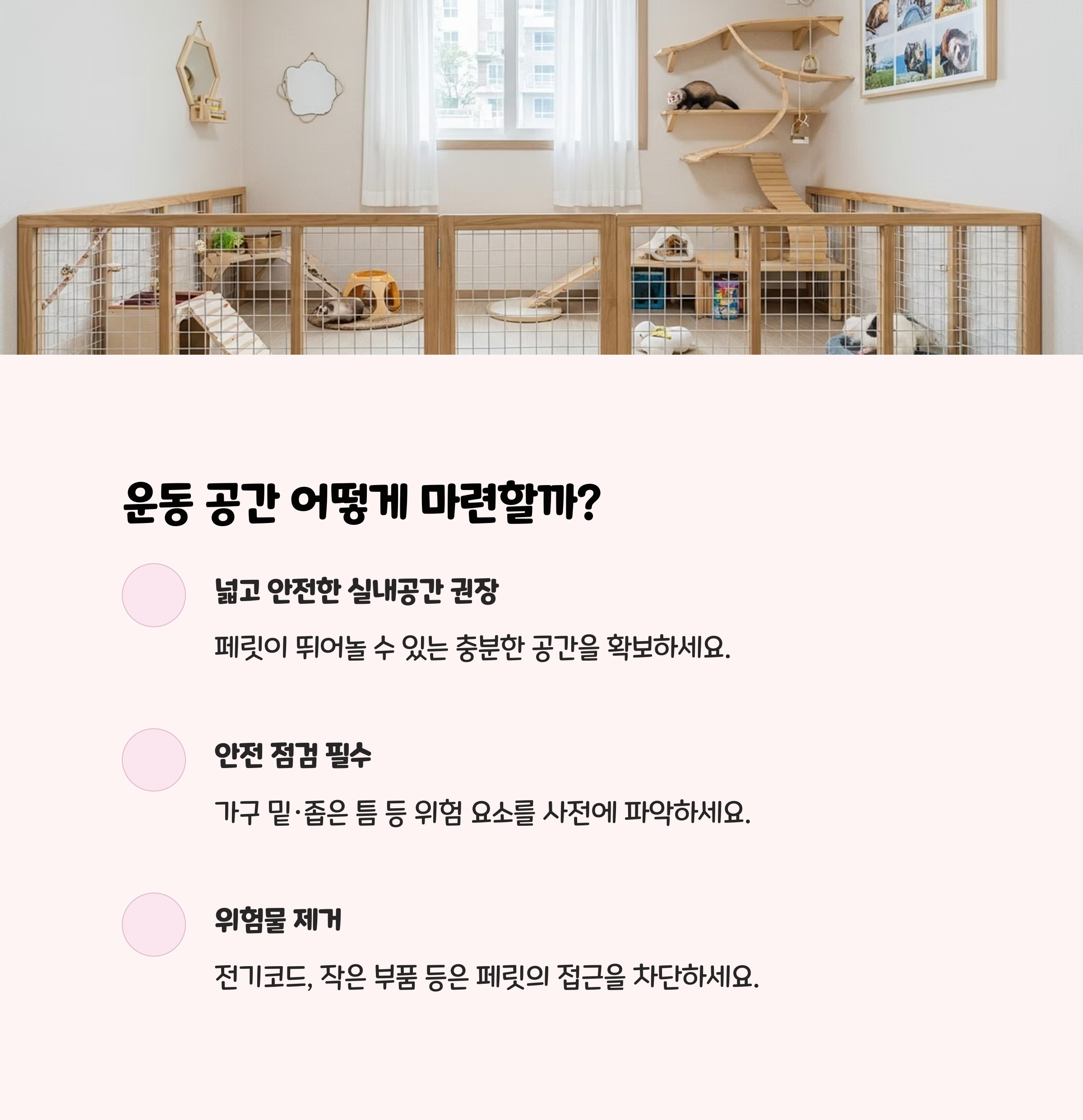 충분한 운동 공간이 필수입니다. 페릿은 강한 호기심과 에너지를 가진 동물로, 하루 최소 3시간 이상의 자유로운 활동 시간이 필요하며, 전용 공간이 절실합니다.- 거주지나 임대계약에서 반려동물 허용 여부를 확인해야 합니다.