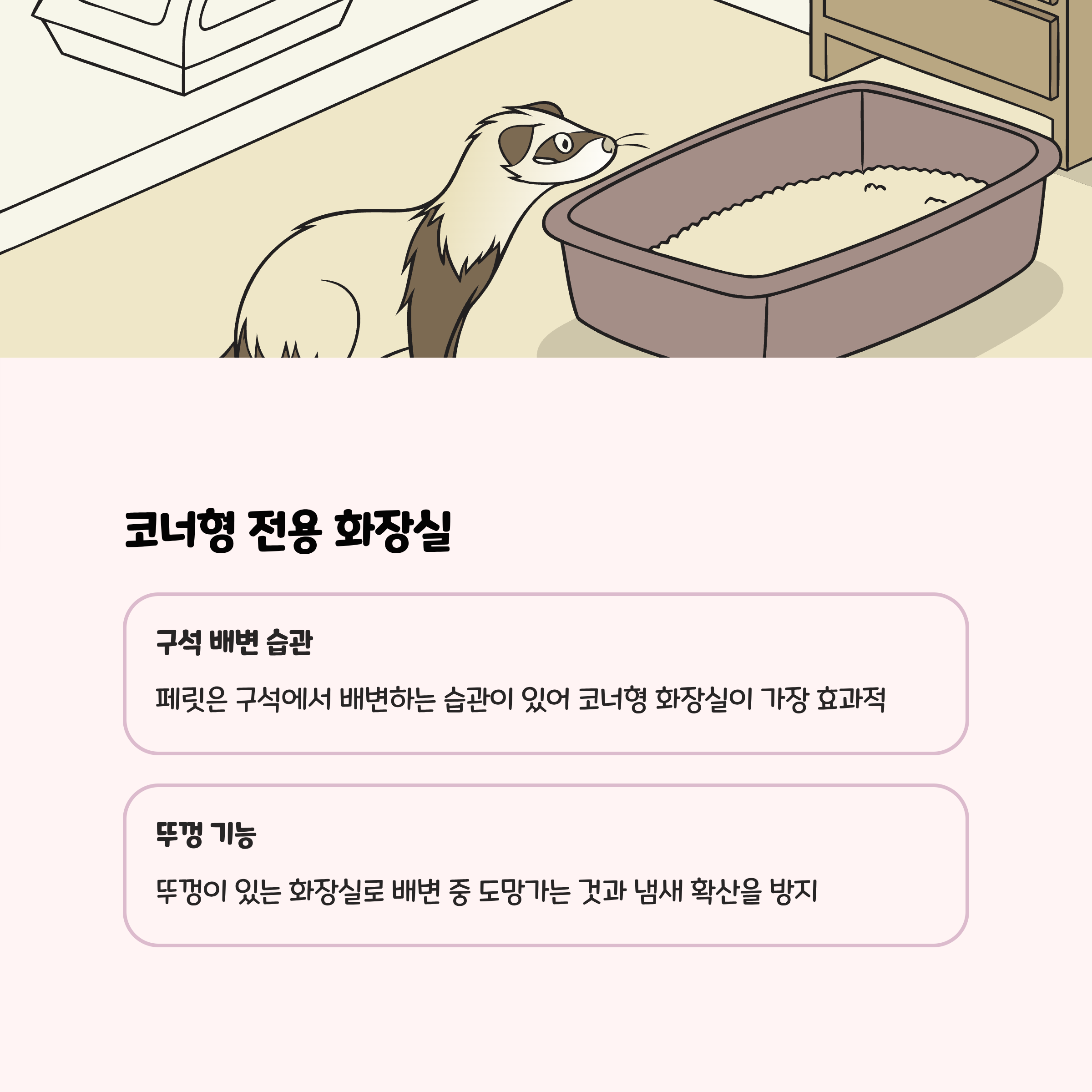 | 화장실+모래 | 코너형 트레이+무향 저먼지 모래 | 배변훈련 가능, 청결 관리 |