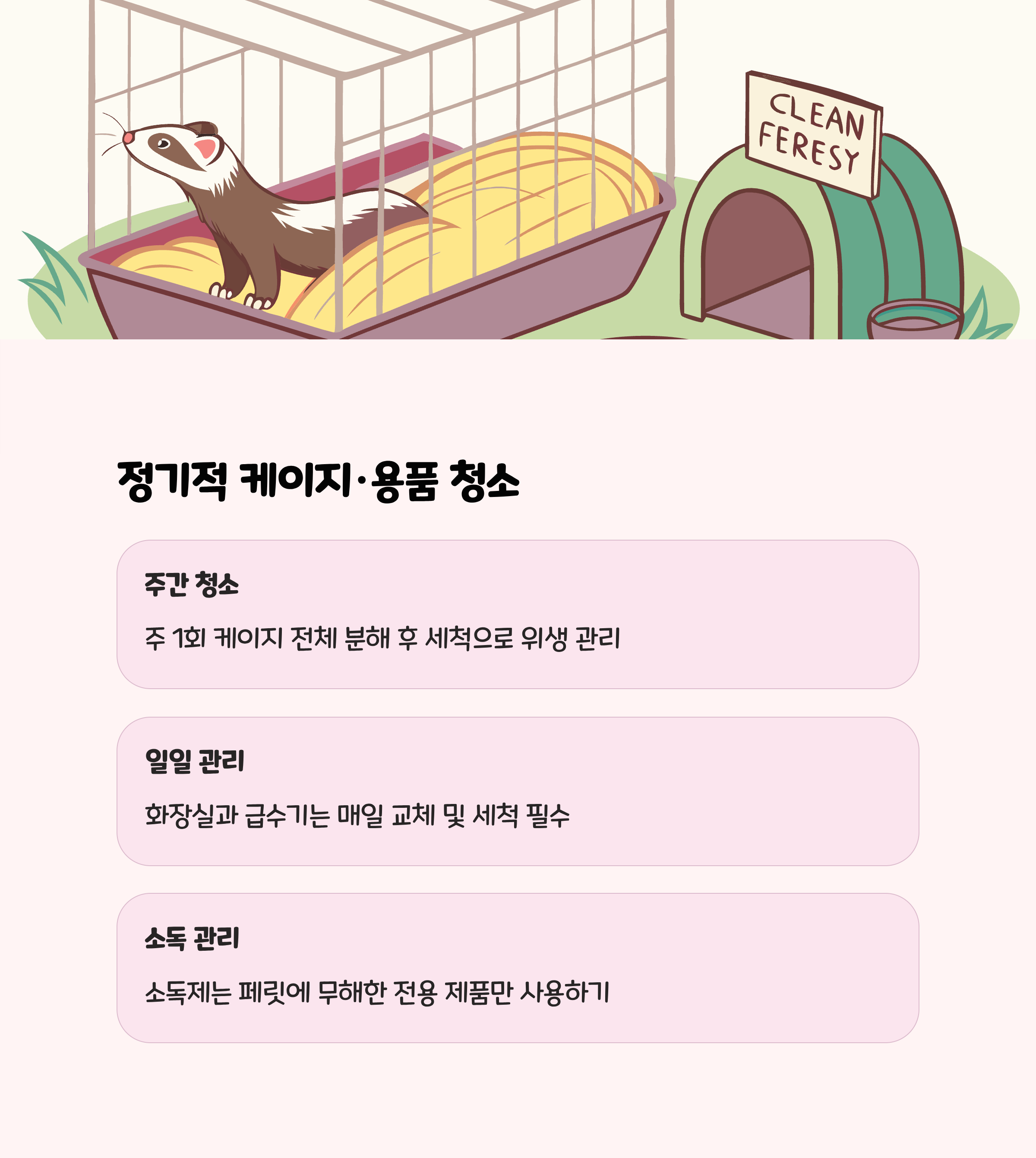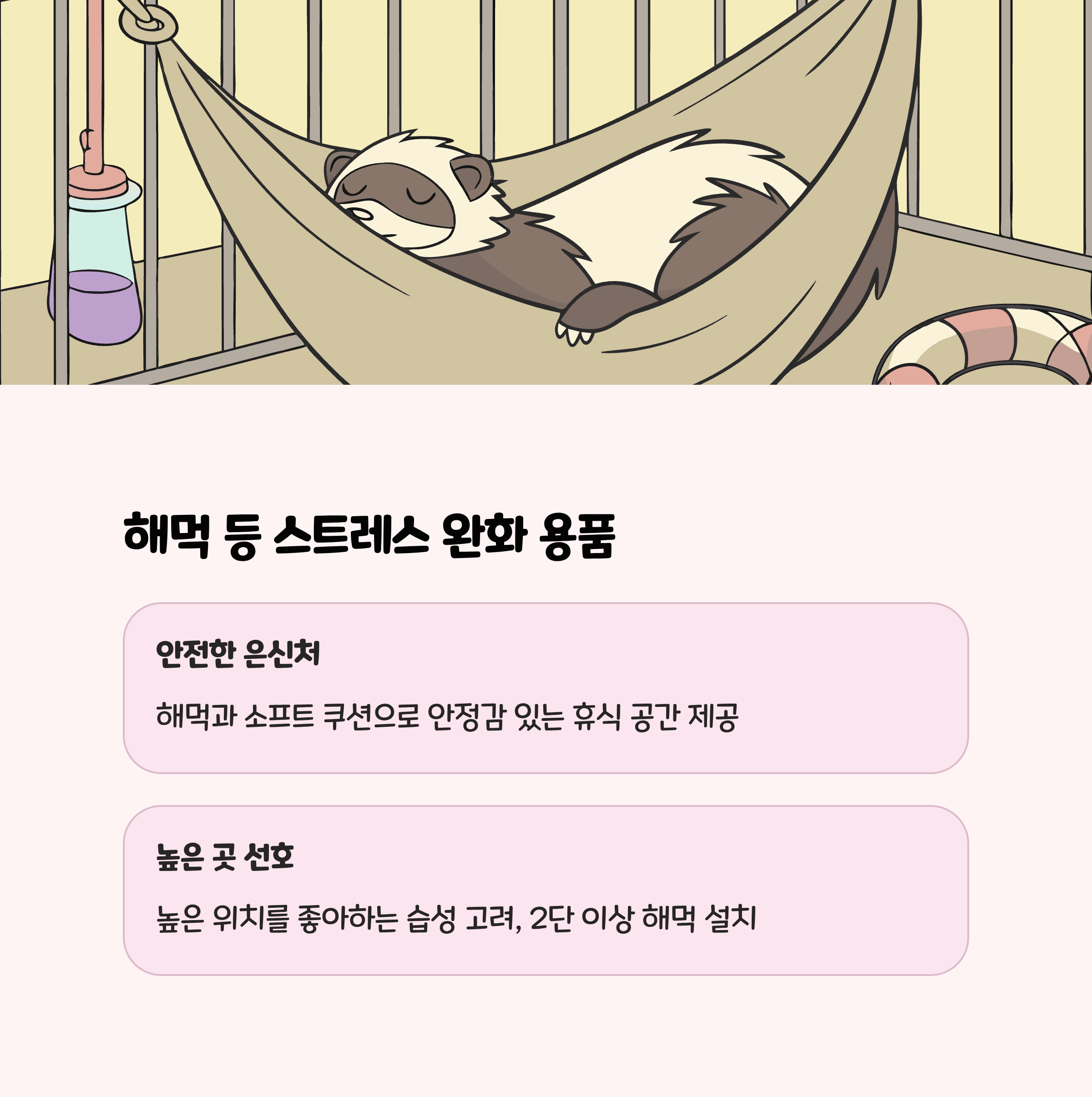 화장실(트레이)+전용 모래: 코너형, 높은 벽이 있는 페릿 전용 트레이와 먼지 없는 모래를 선택해야 합니다. 배변 훈련이 쉽고 청결하게 관리할 수 있습니다.위생용품: 발톱깎이, 귀세정제, 전용 샴푸 등.침구/해먹: 포근하고 세탁이 쉬운 원단의 해먹과 침대 혹은 담요가 필수입니다.