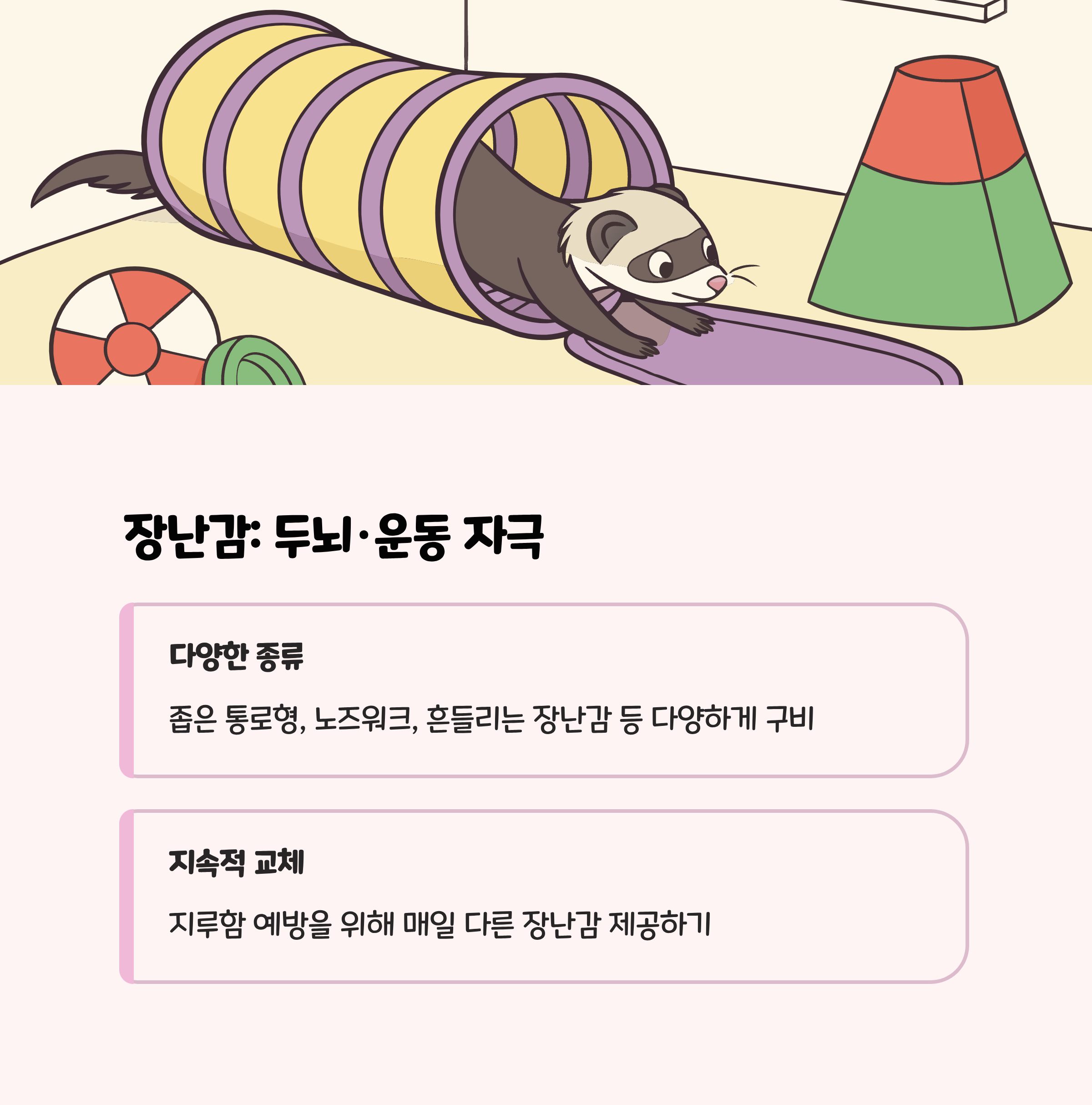 | 장난감/터널/숨숨집 | 플라스틱·천 터널, 볼, 인형 | 스트레스 해소, 지능 발달 |