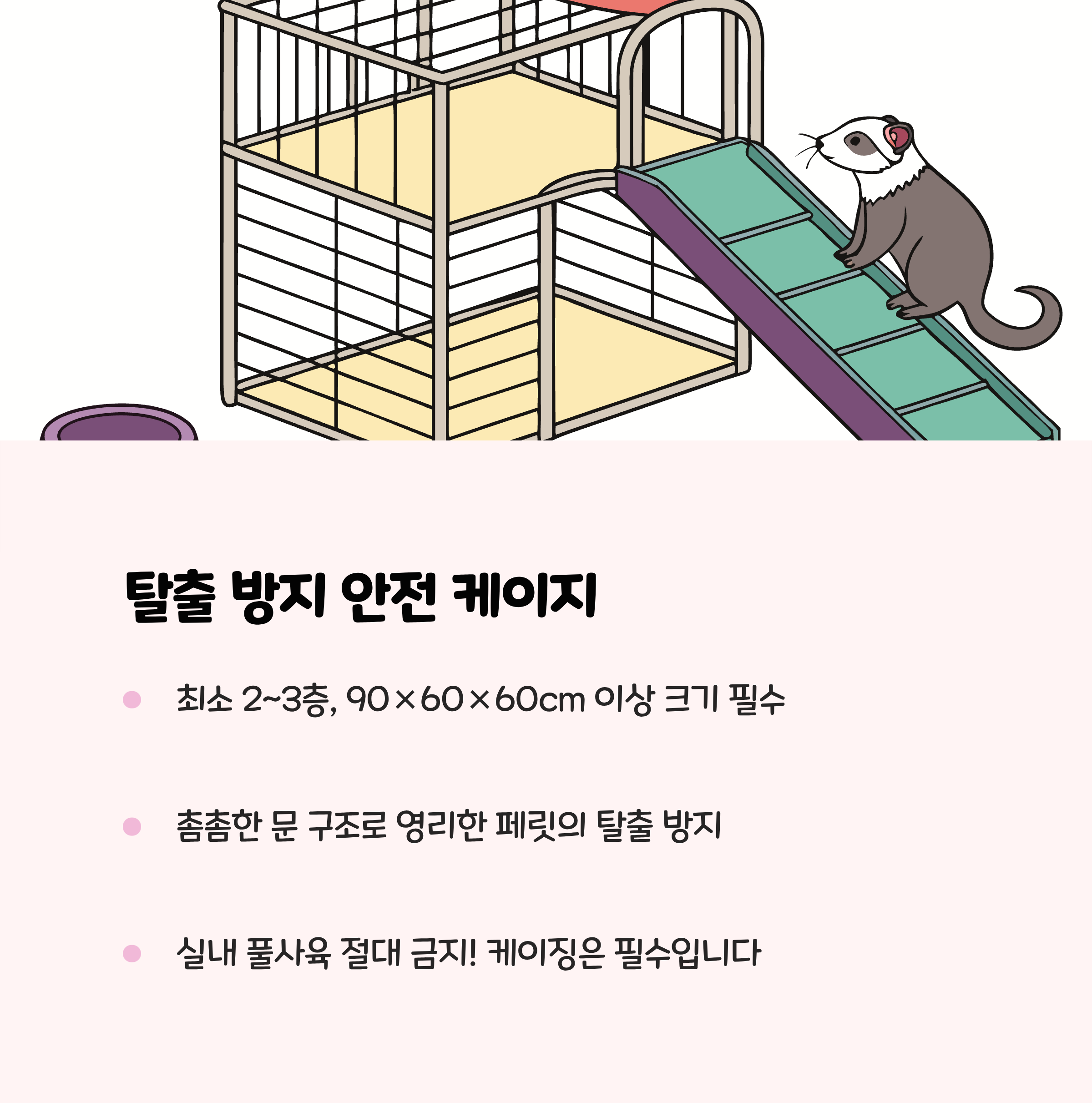 | 전용 케이지 | 2~3층, 90×60×60cm 이상 | 탈출 방지와 충분한 활동, 은신처 배치 |