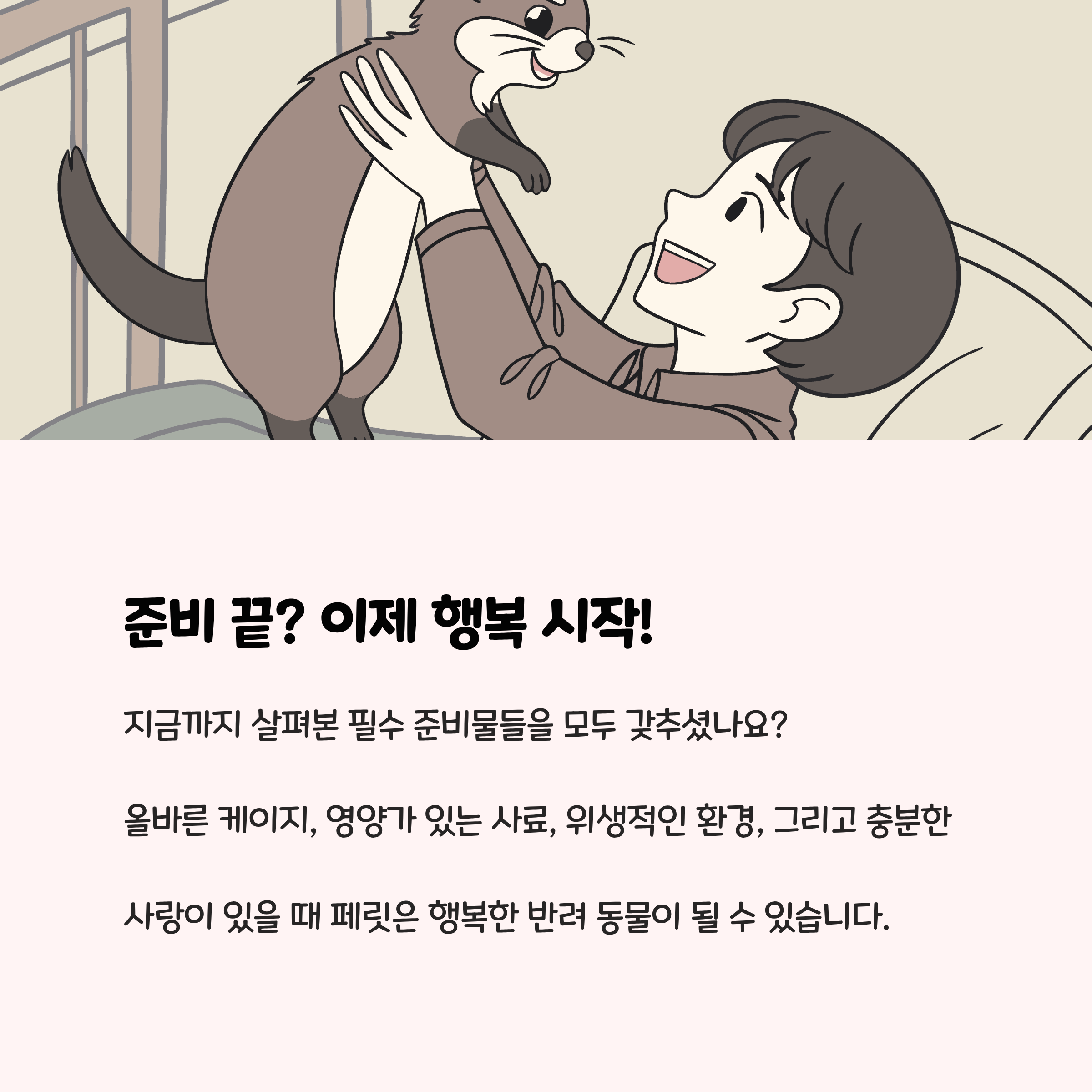 페릿을 분양받기 전 이 리스트를 참고해, 하나씩 체크하며 미리 준비를 마치면 돌봄 생활이 훨씬 편하고 즐거워집니다. 아이와의 첫 만남부터 안정된 환경에서 교감한다면, 걱정 없는 행복한 반려 생활이 시작됩니다.