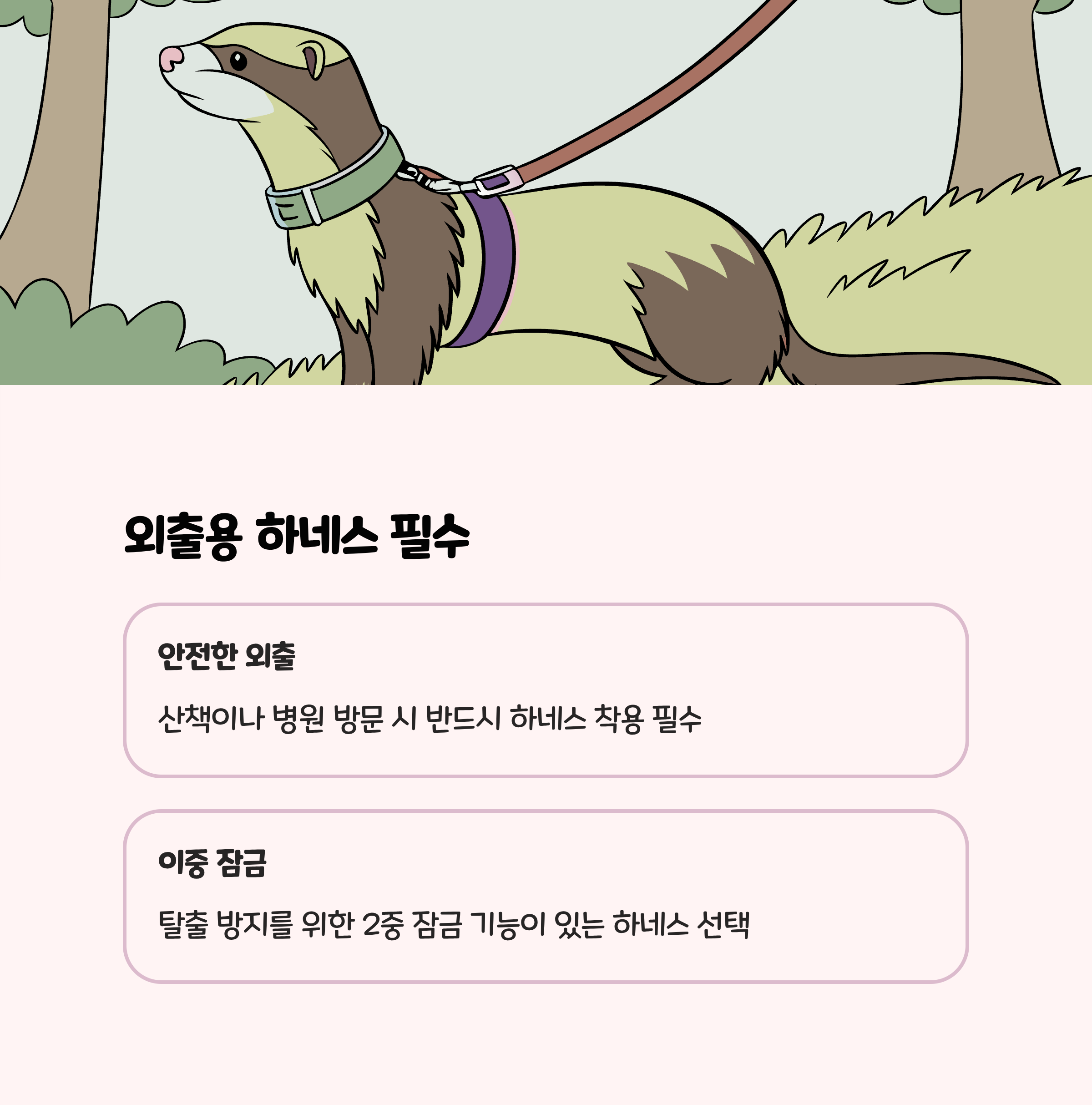| 이동장/하네스 | 페릿 전용 소프트캐리어 | 외출/진료/이동 시 필수 |