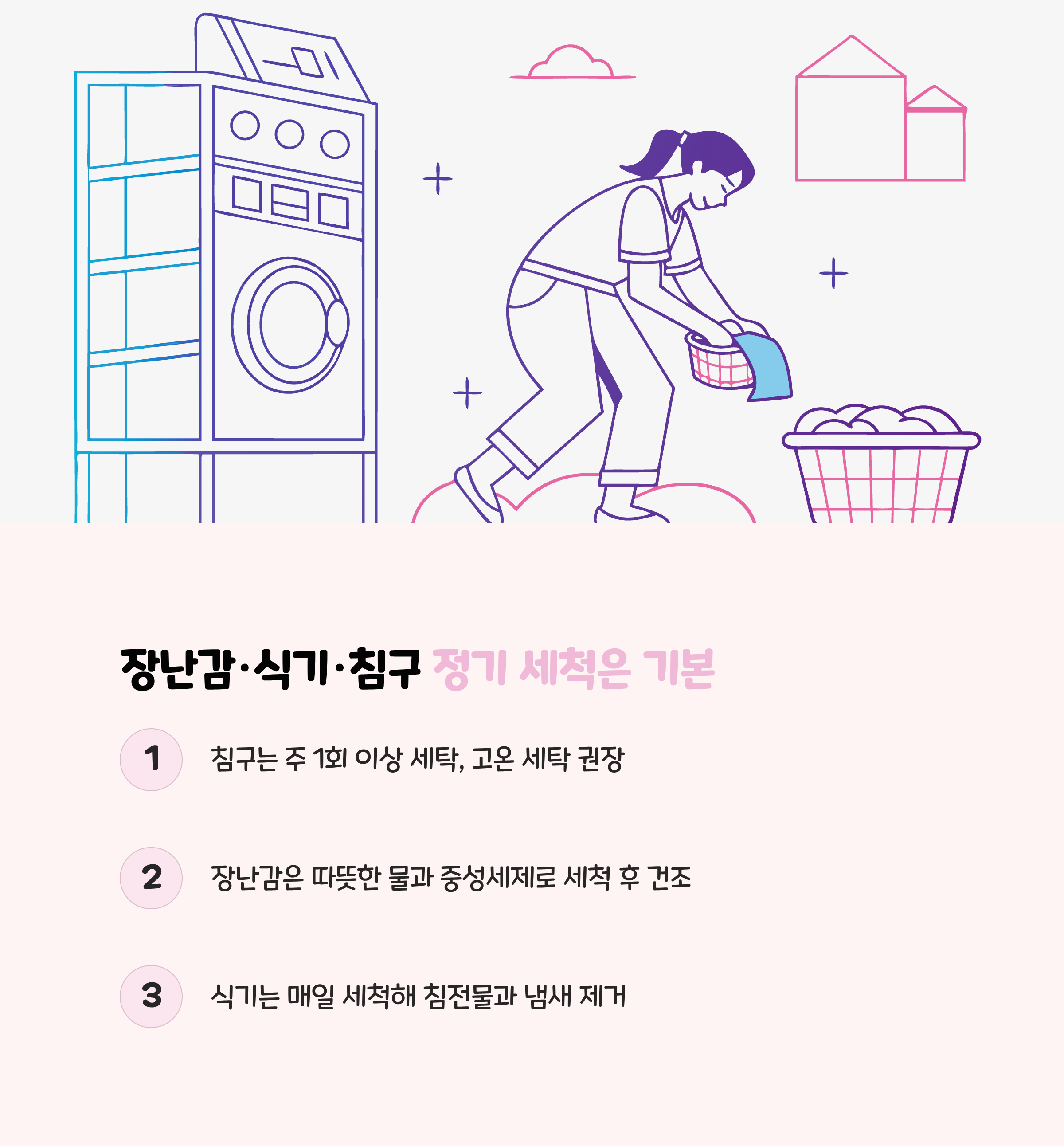 | 용품 위생 관리 | 장난감, 식기, 침구류 정기 세척 및 교체 |