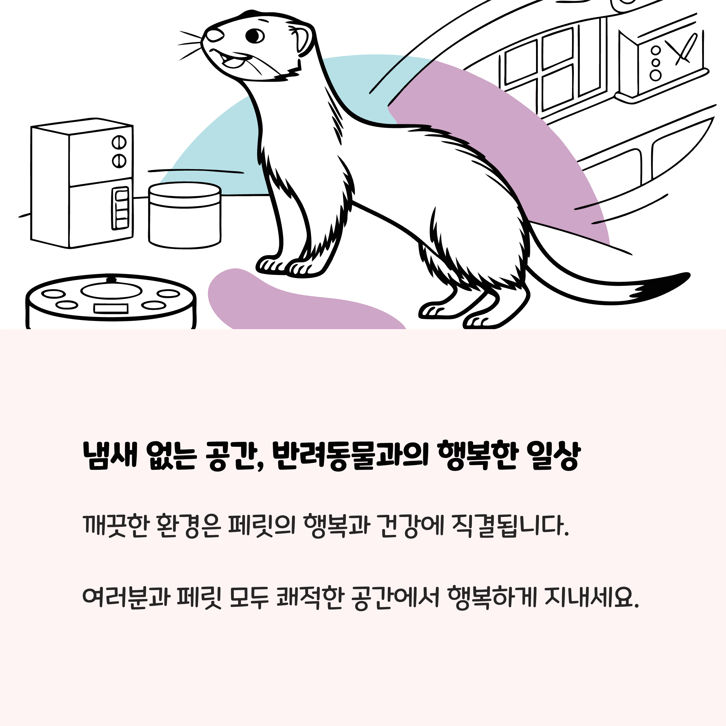 냄새 문제를 해결하려면 단기적으로 방향제에 의존하기보다는 위에서 제시한 근본적이고 꾸준한 관리법을 실천하는 것이 가장 효과적입니다. 몇 가지 작은 변화들이 모이면 페릿과 함께하는 생활공간이 보다 쾌적하고 사랑스러운 환경으로 탈바꿈할 수 있을 것입니다. 사랑하는 반려 페릿과 함께 더욱 건강하고 행복한 일상을 만드시길 바랍니다.