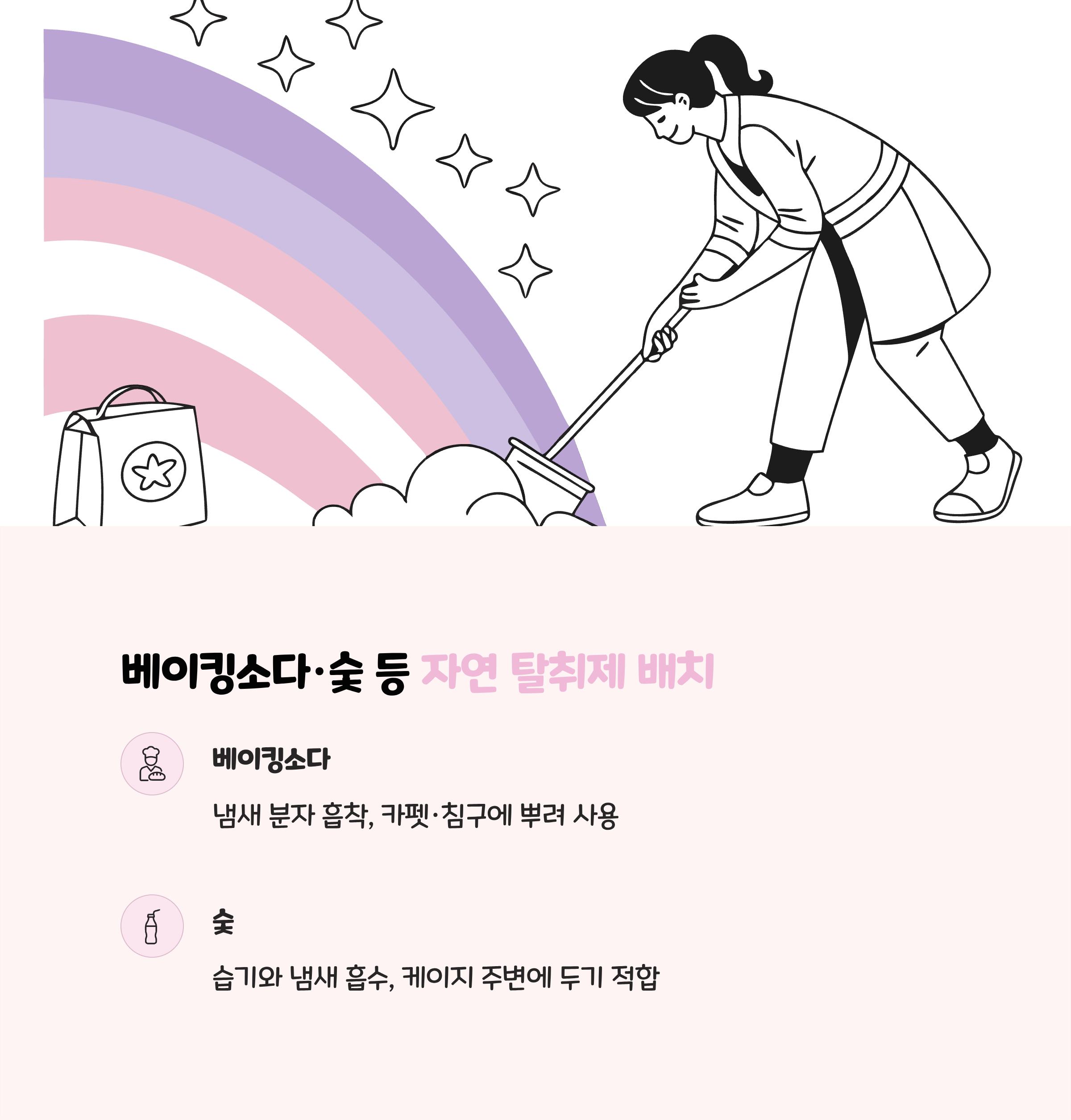 | 자연 탈취제 | 베이킹소다, 커피 찌꺼기, 숯 등을 공간에 배치 |