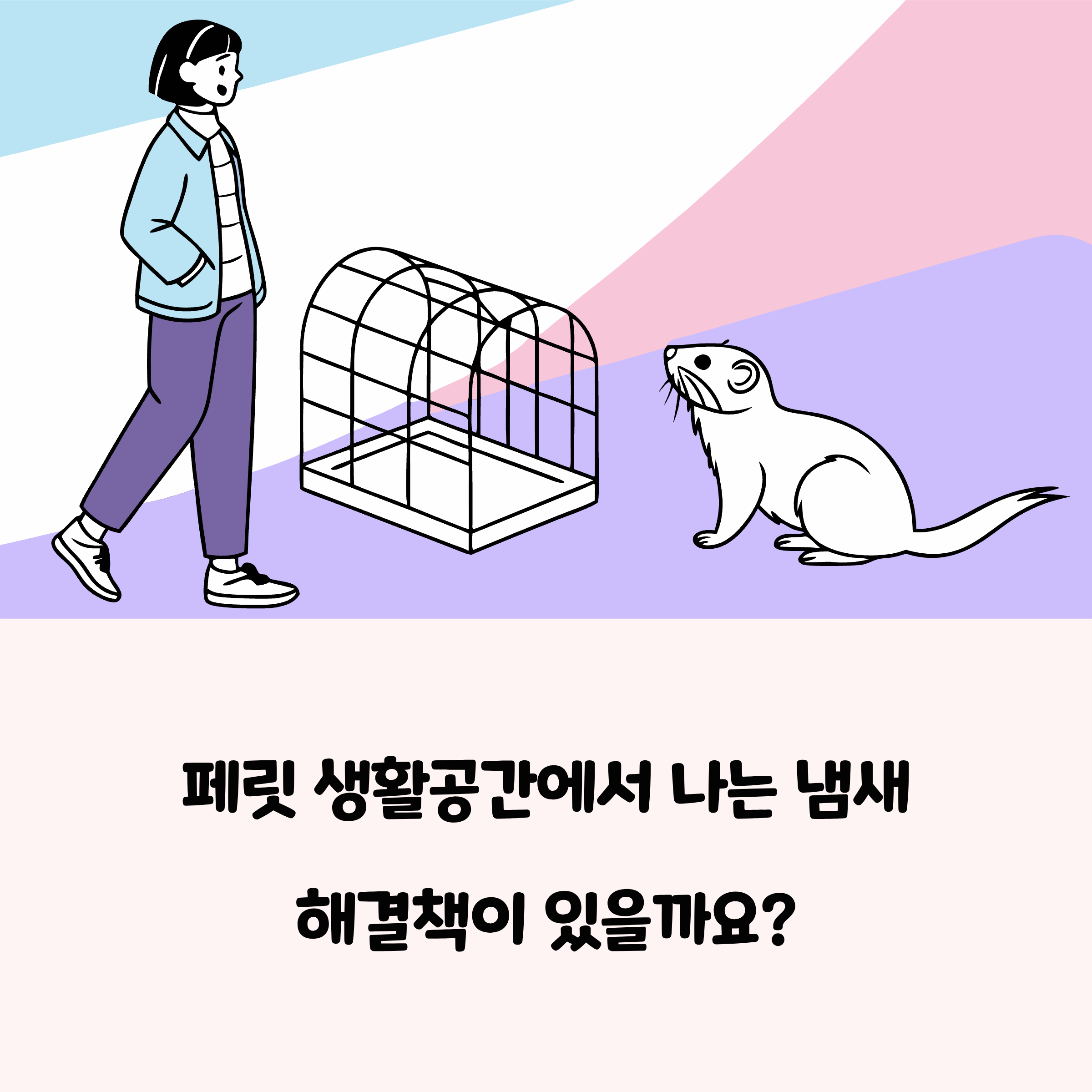 페릿 전용 탈취제나 약국 판매 천연 성분 탈취제(예: 편백수 스프레이)가 안전하고 효과적입니다.